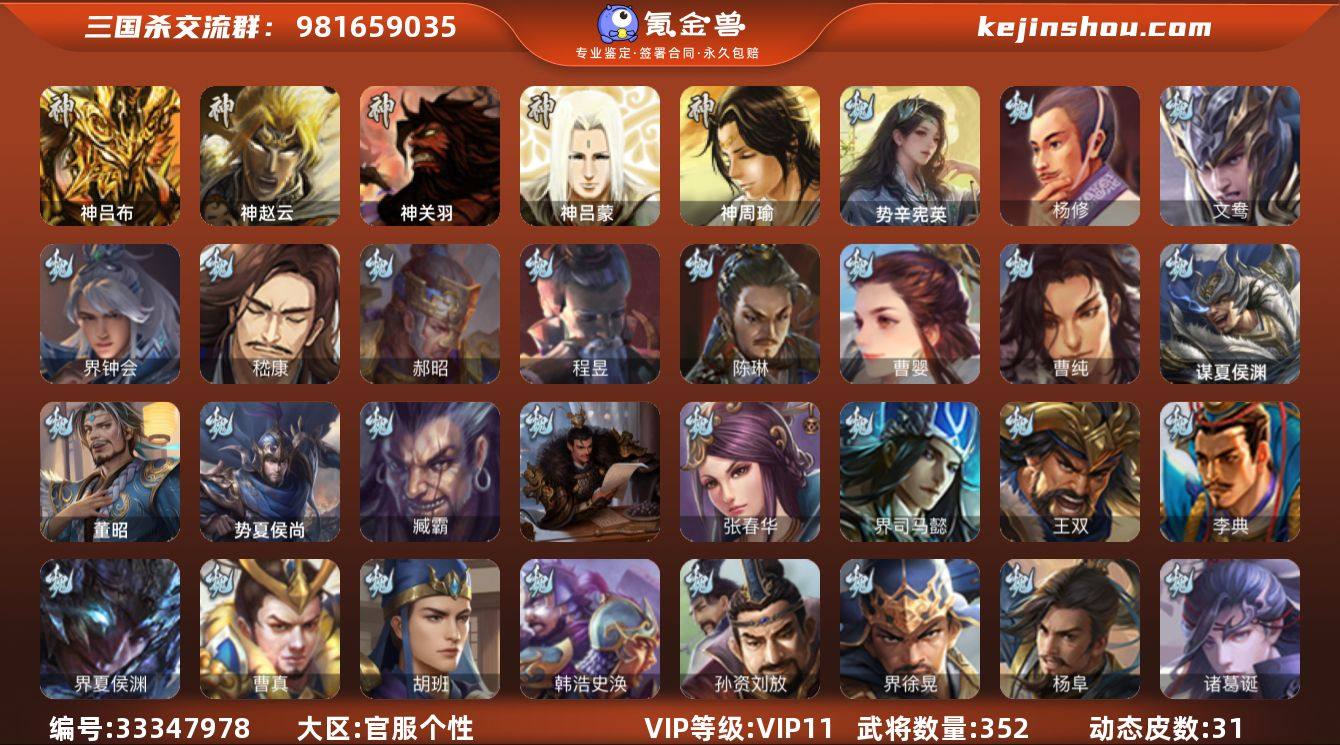【14790135】官阶:大将军;VIP等级:VIP11;史诗武将数量:42;动态皮肤数量:31;武将总数:352;史诗宝珠数量:0;将魂数量:3070;神将:2;魏国史诗武将:7;蜀国史诗武将:8;吴国史诗武将:9;群史诗武将:15