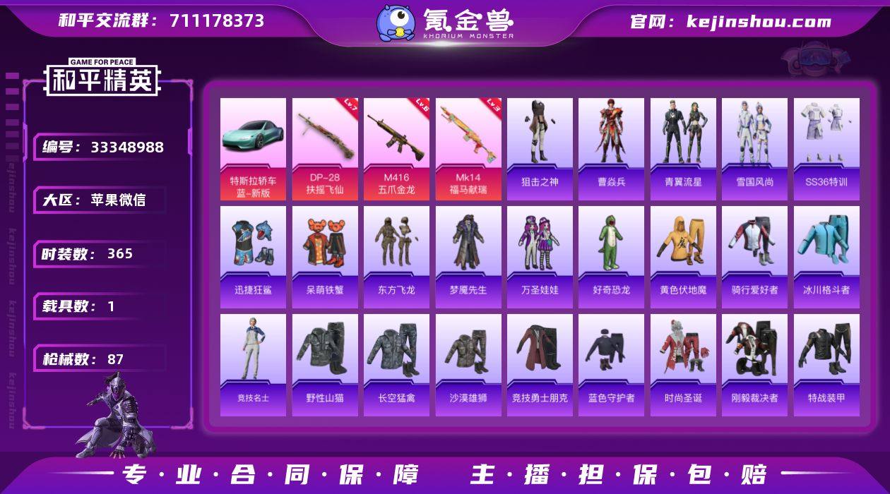 实名: 可修改 时装数: 365 载具数: 1 枪械数: 87 战备数: 1 热门装扮: 呆萌铁蟹,梦魇先生,万圣娃娃,迅捷狂鲨,好奇恐龙,东方飞龙 载具: 特斯拉Roadster(水滴蓝) 稀有枪皮: M416五爪金龙,DP-28扶摇飞仙,MK14-福马献瑞 亮点: 【优质装备】:七级DP-28-扶摇飞仙