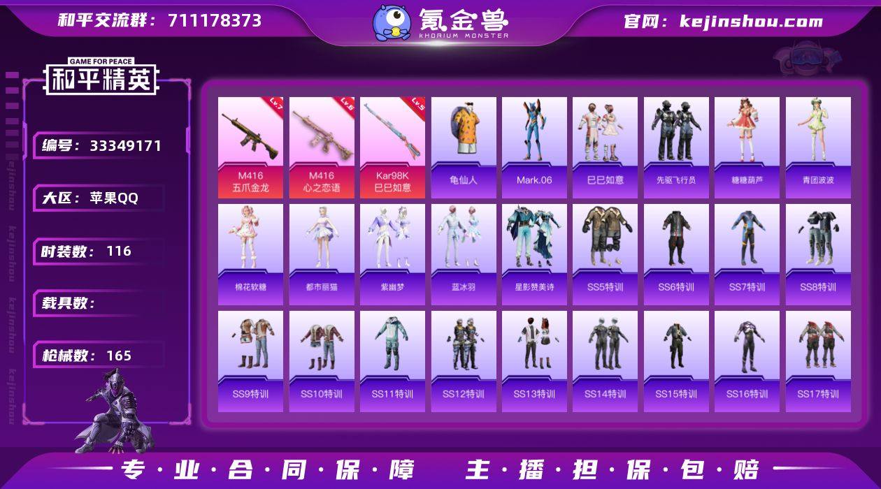 苹果【小号/蓝螳螂/3特效枪-1粉色飞行器】 手Q--50258热力值-5王牌印记-116套装-165枪皮 【热门品类】:套装-龟仙人,角色-Mark.06 【粉色枪皮等级】:M416-五爪金龙(七级),M416-心之恋语(六级),Kar98K-巳巳如意(五级) 【粉色枪皮】:M416-五爪金龙,M416-心之恋语,Kar98K-巳巳如意 【粉色降落伞】:银河战甲降落伞,至尊龙雀降落伞,潮汐统领降落伞,金丰海韵降落伞,临安公主降落伞 【稀有套装】:套装-龟仙人,套装-巳巳如意,套装-先驱飞行员,套装-糖糖葫芦,套装-青团波波,套装-棉花软糖,角色-都市丽猫,套装-紫幽梦,套装-蓝冰羽,套装-星影赞美诗 【稀有枪皮】:AKM-夜灯,AKM-奇异狩猎者,AKM-彩虹符号,AKM-生命誓言,AKM-破晓战魂,AKM-萌趣颜团子,AKM-虎虎生威,AKM-龙的传人,M16A4-幻世战舞者,M16A4-生命誓言,SCAR-L-炫彩节奏,SCAR-L-玉兔迎春,SCAR-L-甜蜜誓约,M416-仓鼠灰灰,M416-夜灯,M416-滑板小狐,M416-紫翼圣骑,M416-绯红前夜,M416-蓝色火焰,GROZA-彩虹符号,GROZA-治愈之星,AUG-天降萌叽,AUG-耀粉歌者,QBZ-原初圣火,QBZ-彩虹符号,QBZ-神秘黑猫,M762-彩虹符号,M762-深海曼妙,M762-烈焰拳霸,M762-牛气冲天,M762-瑞龙福将,M762-...