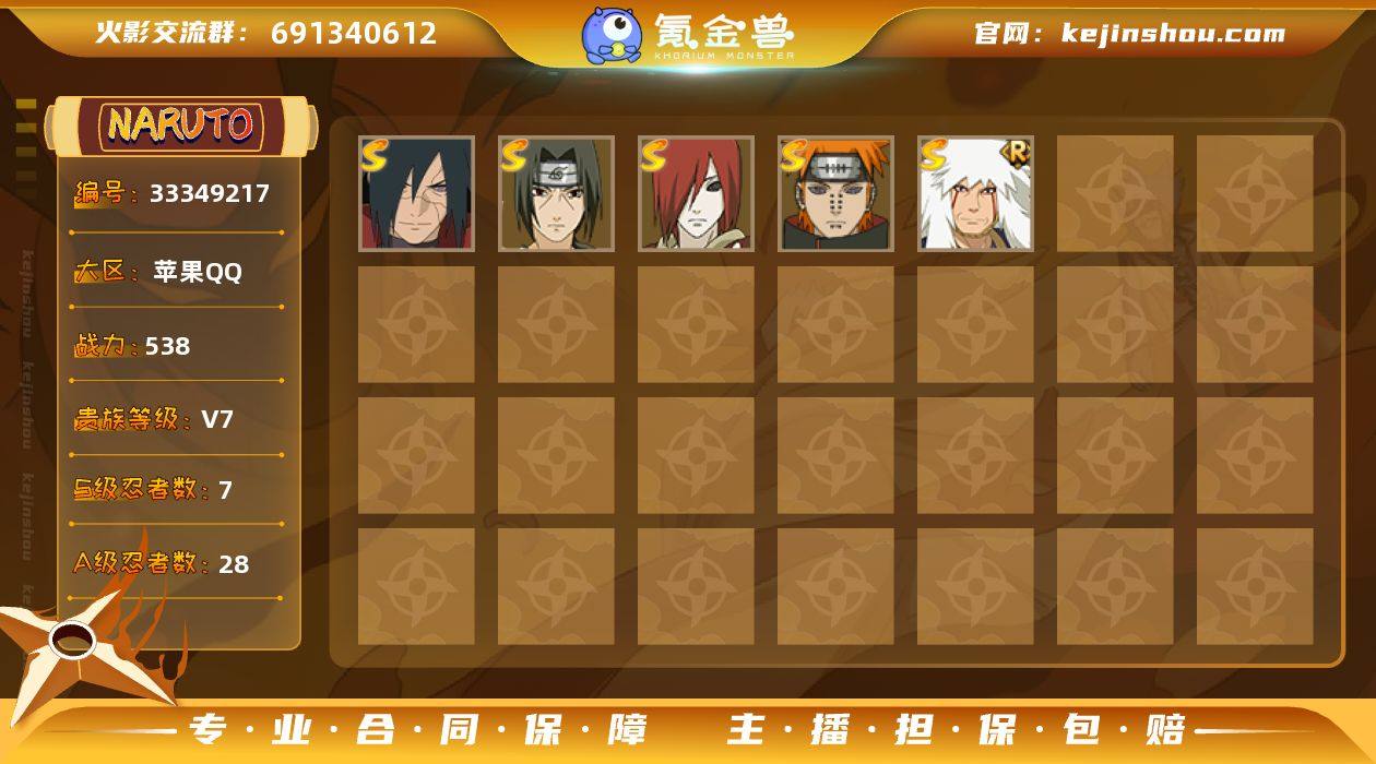 [18629178]V7 7S忍 28A忍 14通灵 538.5W战力 可二次 可修改实名 【S级忍者】宇智波斑「秽土转生·解」,自来也 「舞之豪杰」,漩涡鸣人·宇智波佐助,宇智波带土「十尾人柱力」,长门「秽土转生」,宇智波鼬 「须佐能乎」,佩恩「天道」