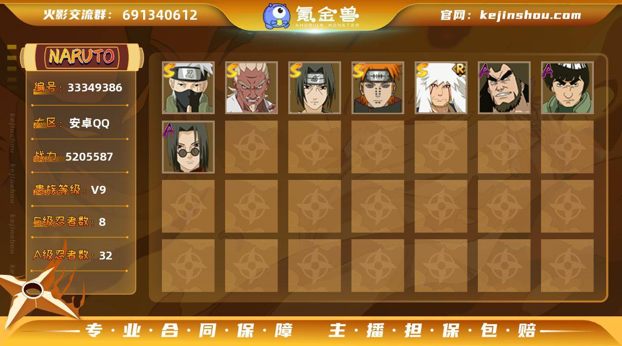 安卓qq-包人脸/500万战力/198忍者5个/S忍者数:8- A忍者数:32【S级忍者】宇智波带土「十尾人柱力」(3星),猿飞日斩「秽土转生」(3星),旗木卡卡西「须佐能乎」(3星),艾「忍界大战」(3星),自来也「舞之豪杰」(3星),宇智波鼬「须佐能乎」(3星),漩涡鸣人·宇智波佐助(3星),佩恩「天道」(3星),【A级忍者】宇智波佐助「须佐能乎」(2星),旗木卡卡西「幻之真容」(2星),波风水门「新春限定」(2星),小南「夏日泳装」(2星),迪达拉「秽土转生」(2星),李洛克「忍界大战」(2星),蝎「绯流琥」(2星),宇智波泉奈(2星),神农「羁绊」(2星),干柿鬼鲛(3星),猿飞阿斯玛(4星),迈特凯(4星),蝎(2星),迪达拉(2星),我爱罗「疾风传」(2星),飞段(2星),飞段「死司凭血」(2星),宇智波鼬(2星),日向雏田「最终章」(2星),不缘(2星),长十郎「六代目水影」(2星),神秘面具男「忍者之路」(2星),宇智波佐助「万花筒写轮眼」(2星),旗木卡卡西「神威对决」(2星),猿飞阿斯玛「神驹佑将」(2星),小南「神驹佑将」(2星),漩涡博人「桃式显现」(2星),宇智波鼬「夏日限定」(2星),迈特凯「青春爆炸」(2星),巳月「仙人模式」(2星),机械鸣人「初始形态」(2星),土台「忍界大战」(2星),