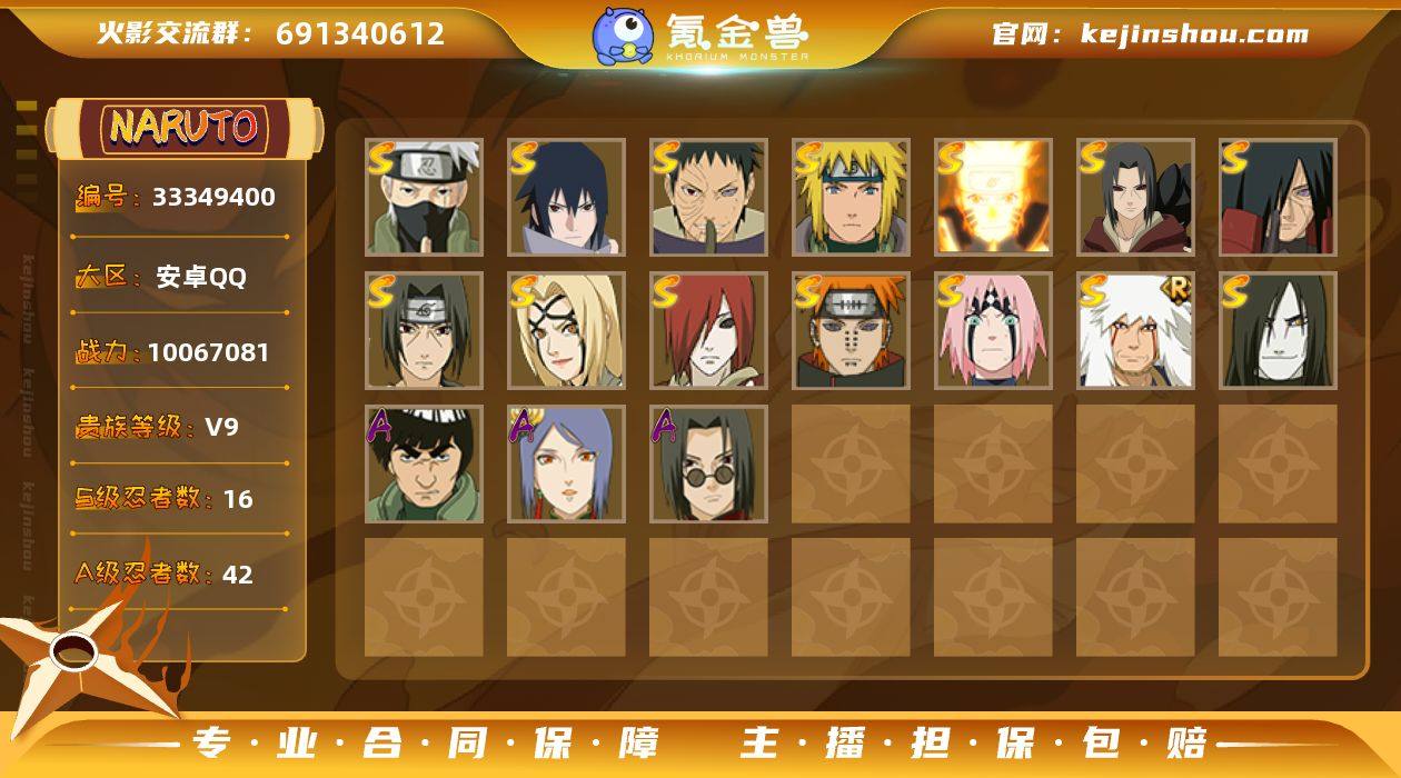 安卓QQ-可改二次-v9-1006w战力号-捡漏号-买到就是赚到-多个直购a忍-宇智波带土「暴怒」小南「新春限定」波风水门「新春限定」旗木卡卡西「万花筒写轮眼」小南「漂泊浪客」-S忍者数:16- A忍者数:42 【S级忍者】宇智波带土「忍界大战」(3星),旗木卡卡西「须佐能乎」(3星),宇智波斑「秽土转生·解」(3星),宇智波佐助「永恒万花筒」(3星),春野樱「忍界大战」(3星),长门「秽土转生」(3星),漩涡鸣人「九喇嘛连结」(3星),宇智波斑「秽土转生」(3星),自来也「舞之豪杰」(3星),宇智波鼬「秽土转生」(3星),宇智波鼬「须佐能乎」(3星),漩涡鸣人·宇智波佐助(3星),佩恩「天道」(3星),波风水门(3星),大蛇丸(3星),纲手「百豪」(3星), 【A级忍者】宇智波佐助「须佐能乎」(2星),宇智波带土「暴怒」(2星),大蛇丸「晓」(2星),药师兜「半蛇斗篷」(2星),漩涡鸣人「仙人模式」(2星),漩涡鸣人「九尾查克拉」(2星),小南「新春限定」(2星),波风水门「新春限定」(2星),迪达拉「秽土转生」(2星),黑土「四代目土影」(2星),千代「近松十人卫」(2星),李洛克「忍界大战」(2星),不动(2星),蝎「绯流琥」(2星),秋道丁次「忍界大战」(2星),宇智波泉奈(2星),照美冥「五代目水影」(2...