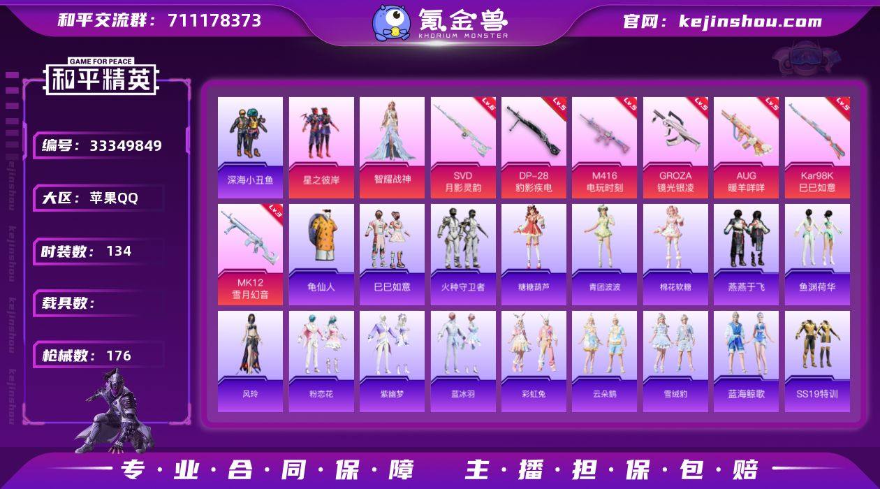苹果 手Q-3粉装-7特效枪-0载具-1粉色飞行器-51378热力值-12王牌印记-134套装-176枪皮 【热门品类】:套装-深海小丑鱼,套装-龟仙人 【粉色套装】:粉装-星之彼岸,角色-智耀战神,角色-鸢尾珑雾 【粉色枪皮等级】:M416-电玩时刻(五级),GROZA-镜光银凌(五级),AUG-暖羊咩咩(五级),Kar98K-巳巳如意(五级),SVD-月影灵韵(六级),MK12-雪月幻音(三级),DP-28-豹影疾电(五级) 【粉色枪皮】:M416-电玩时刻,GROZA-镜光银凌,AUG-暖羊咩咩,Kar98K-巳巳如意,SVD-月影灵韵,MK12-雪月幻音,DP-28-豹影疾电 【粉色飞行器】:炫彩糖果飞行器 【粉色降落伞】:星之彼岸降落伞,超新星降落伞,创世·救赎降落伞,金丰海韵降落伞,雪月幻音降落伞,炫彩糖果降落伞 【稀有套装】:套装-龟仙人,套装-巳巳如意,套装-炫彩糖果,套装-火种守卫者,套装-糖糖葫芦,套装-青团波波,套装-棉花软糖,套装-燕燕于飞,套装-鱼渊荷华,角色-风玲,套装-粉恋花,套装-紫幽梦,套装-蓝冰羽,套装-彩虹兔,套装-云朵鹅,套装-雪绒豹,套装-蓝海鲸歌,套装-雨过天青,套装-红釉青花,角色-皓月伶影 【稀有枪皮】:AUG-冰晶雪宝,AKM-彩虹符号,AKM-破晓战魂,AKM-霓虹街区,AKM-龙的传人,M16A4-幻世...
