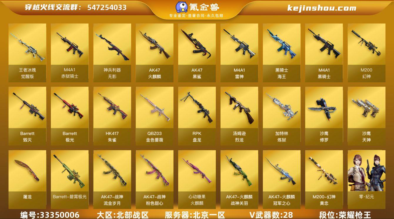 北京一区-31V-2王者武器数-0炫金武器数 【热门武器】:QBZ03-金色蔷薇,HK417-朱雀,M200-幻神,M4A1-黑骑士,汤姆逊-烈龙*6,RPK-盘龙,加特林-炼狱,沙鹰-修罗,金刚伞 【音效卡】:Barrett-毁灭音效卡,Barrett-碧霄极光音效卡*3,绝迹语音包 【皮肤】:M200-幻神-黄忠皮肤,幻神-降龙,火麒麟-冠军之心,火麒麟-战神关羽,火麒麟-心动糖果,战神-粉色甜心皮肤,战神-流金岁月皮肤 【角色】:零·纪元,太空指挥官,不败狙神,乔伊教练,修道士,云海玲珑,炽天使,暗夜-X,初恋灵狐,嘉年华灵狐,灵狐者-X,龙儿,潘多拉-X,青霞仙子,斯沃特-X,铁骑荣耀,兔囡囡,职业选手 【人偶武器】:AWM-灵狐-15周年嘉年华,迷你牛魔王 【暴走生化】:双面神-竞魂 【英雄级武器】:AK47-火麒麟*2,M4A1-雷神,M4A1-黑骑士,AK47-黑鲨,HK417-朱雀,QBZ03-金色蔷薇,无影-神兵利器,王者冰魄-觉醒版,黑骑士-海王*3,白虎之魄-觉醒版,Barrett-毁灭,Barrett-极光,M200-幻神,RPK-盘龙,加特林-炼狱,汤姆逊-烈龙*6,沙鹰-修罗,沙鹰-天神,屠龙,闪光弹-竞技荣光,烟雾弹-神工天巧,M4A1-赤狱骑士,AK47-竞魂无影,Barrett-碧霄极光 【其他武器】:源·火麒麟,魂·火麒麟-百城,源-...
