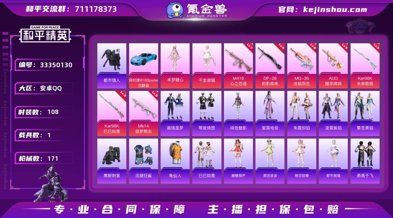 安卓 手Q-2粉装-7特效枪-1载具-2粉色飞行器-47220热力值-11王牌印记-108套装-171枪皮 【热门品类】:套装-都市猎人,套装-龟仙人 【粉色套装】:角色-千金淑猫,角色-羊梦糖心 【粉色枪皮等级】:M416-心之恋语(七级),AUG-暖羊咩咩(五级),Kar98K-未来歌姬(五级),Kar98K-巳巳如意(五级),Mk14-甜梦熊击(五级),DP-28-豹影疾电(五级),MG-36-沧焰双生(五级) 【粉色载具】:保时捷918 Spyder(沉静蓝) 【粉色枪皮】:M416-心之恋语,AUG-暖羊咩咩,Kar98K-未来歌姬,Kar98K-巳巳如意,Mk14-甜梦熊击,DP-28-豹影疾电,MG-36-沧焰双生 【粉色飞行器】:炫彩糖果飞行器 【粉色降落伞】:垂柳戏鸭降落伞,旋转彩虹降落伞,海螺星光降落伞,月影灵韵降落伞,幻彩电音降落伞,无垠阁降落伞,喜羊羊与灰太狼降落伞,异瞳寒姬降落伞,天象三御降落伞,炫彩糖果降落伞 【稀有套装】:套装-龟仙人,套装-巳巳如意,套装-雪国风尚,套装-炫彩糖果,套装-马上来财,套装-糖糖葫芦,套装-青团波波,套装-棉花软糖,角色-都市丽猫,套装-燕燕于飞,套装-鱼渊荷华,套装-紫幽梦,套装-蓝冰羽,角色-瑰梦爱神,套装-星渊小夜曲,套装-云朵鹅,套装-雪绒豹,角色-夜瞳黯灵,套装-朱霞炽焰,套...