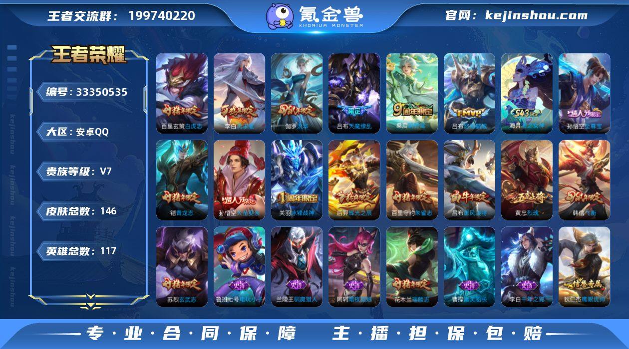 【王者荣耀】珍品无双0 典藏0 无双0 珍品传说0 传说6 史诗42 英雄117 皮肤146 贵族0级 传说皮肤:鸣野蒿|白虎志|凤求凰|怒海麟威|太华|天魔缭乱__稀有限定:御风骁将|至尊宝|瑞麟志|青龙志|玄武志|朱雀志|大圣娶亲|玄嵩|飞衡|烈魂|梁祝|白昼王子|冰锋战神|繁星吟游|海滩派对|海盐诗旅|幻夜卜梦|皇家上将|辉光之辰|混沌棋|火炮绅士|金庭之子|凯尔特女王|炼金王|魔术师|女武神|擒涛扼浪|穷奇|驱傩正仪|沙漠行僧|朔风刀|饕餮|醍醐杖|天穹祈灯|万华元夜|王者之锤|驯魔猎人|演武夺筹|疑决卦|阴阳师|遇见飞天|御銮|御狮|原初追逐者|暗夜猫娘|冰冠公主|苍穹之光|乘风破浪|地狱岩魂|电玩小子|鬼剑武藏|吕布-末日机甲|魅力维加斯|圣诞狂欢|赵云-未来纪元|星夜王子|鹰眼统帅|幽灵船长|逐浪之夏|百里守约-百相守梦|老夫子-百相守梦|噬灭天穹|心灵战警|千年之狐|特工魅影|谧流熔炉|御霄|狰|烛龙|原初探秘者|云中旅人|逆浪荇歌|黄忠-百相守梦|周瑜-线条小狗|海之女神__优质皮肤:创世神祝|孤猎|熊喵少女|锦衣卫|超能战警|英喵野望|战争骑士|画中游|绝影神枪|地府判官|赤焰之缨|三太子|精灵王|剑舞者|范海辛|极冰防御线|灼热之刃|圣殿之光|霓裳曲|加勒比小姐|精灵公主|功夫炙烤|潮玩探月行|秘密...