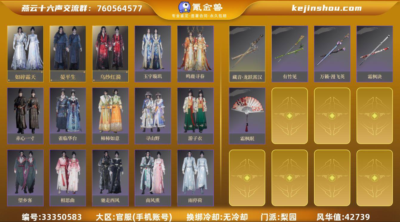 瑞鹤仙,碎冰冰,鸣鹿,空山寻梅,瀚海千山,龙跃霄汉,万剑归宗,新玉振扬音全套已出70抽袅袅保底,700万宝钱4.3鹅装备和叠音还未拉满还有提升空间