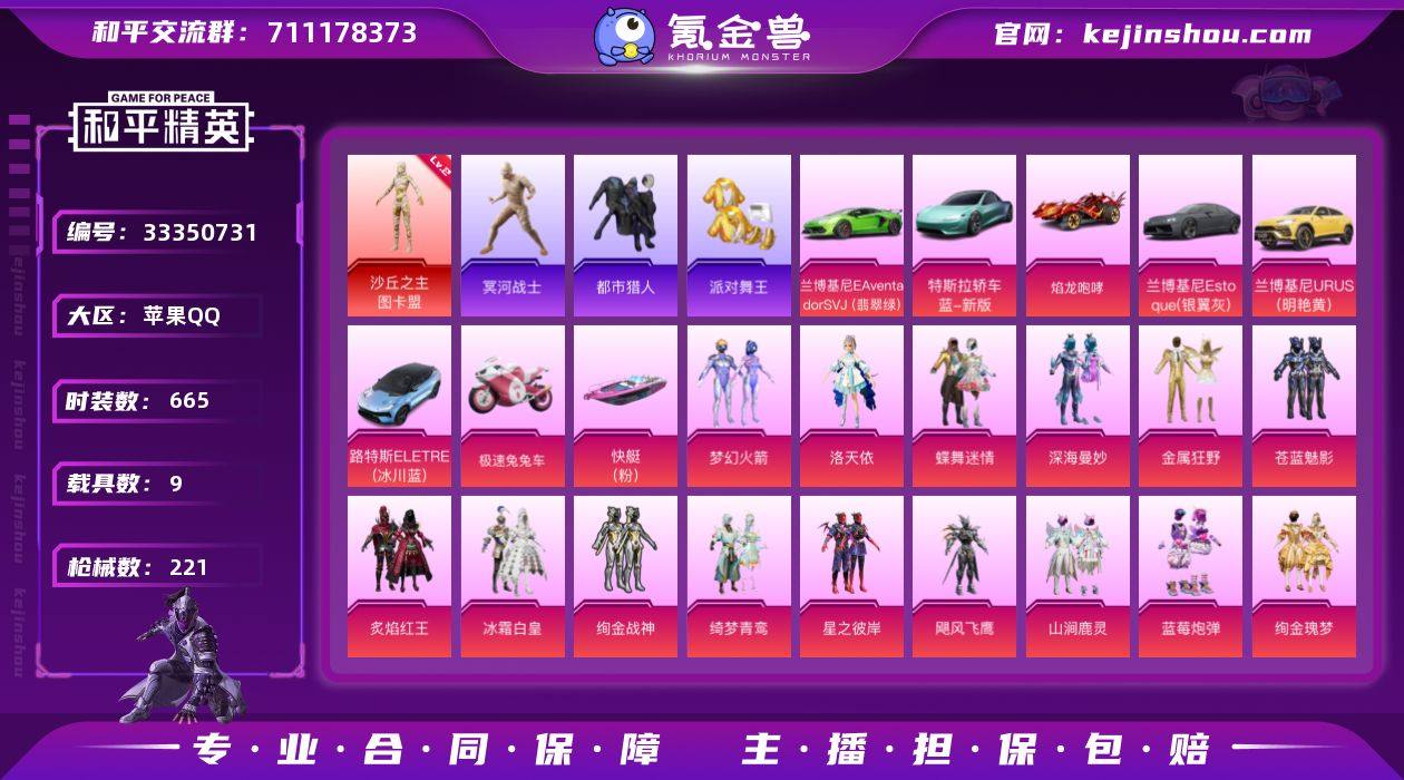 9载具-179套装-221枪皮-图卡盟 木乃伊 都市 金鞋子1红装6稀有9载具16粉装15特效枪20热门179套装221枪皮 94342热力值 6印记 历史绝世王牌16星 【1红装】 沙丘之主-图卡盟 (2级) 【6稀有】 木乃伊 AKM-百万伏特 都市猎人 浪漫天命 派对舞王 派对舞王(金靴子) 【10载具】 暮色幽蹄 路特斯EL蓝色 兰博轿车灰色 兰博SUV黄色 兰博SVJ绿色 特斯拉R水滴蓝 焰龙咆哮 塞莎霓虹粉 (1级) 极速兔兔车 萌兔起飞僚机 【16粉装】 梦幻火箭 蝶舞迷情 洛天依 深海曼妙 金属狂野 苍蓝魅影 绚金战神 冰霜白皇 炙焰红王 绮梦青鸾 星之彼岸 飓风飞鹰 暗夜玫瑰 山涧鹿灵 绚金瑰梦 蓝莓炮弹 【15特效枪】 AKM-暮色玫影 (3级) M416-心之恋语 (5级) AKS-74U-森灵之息 (5级) Kar98K-巳巳如意 (5级) DP-28-豹影疾电 (5级) M762-激战未来 (5级) UZI-绮梦青鸾 (4级) AUG-星之彼岸 (2级) AKM-梦之光华 (5级) 野牛-流星咚咚 (1级) VSS-烈焰拳霸 (1级) MG3-洛神天依 (2级) Mk14-福马献瑞 (5级) ACE32-萌骑漫游 (2级) SCAR-L-青春物语 (6级) 【20热门】 龟仙人 雪山精英 鹰眼刺客 激萌罗小黑 大橘为重 罗小黑 梦起落英 梨园星光 迪迦奥特曼 赛罗奥特曼 醒狮腾龙 团圆交子 瑞龙福将 漫步者 薄荷蓝莓 抹茶蜜豆 破...