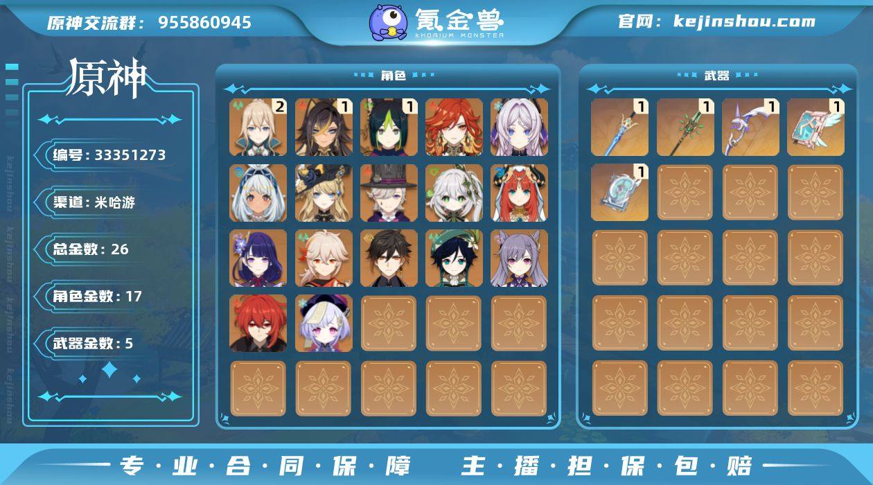 57级/26黄/女主/17个五星角色/5个五星武器 0命娜维娅,0命林尼,1命迪希雅,0命纳西妲,0命妮露,1命提纳里,0命雷电将军,0命枫原万叶,0命钟离,0命温迪,0命刻晴,0命七七,2命琴,0命迪卢克,0命玛拉妮,0命玛薇卡,0命茜特菈莉,精1苍古自由之誓,精1四风原典,精1和璞鸢,精1阿莫斯之弓,精1天空之卷
