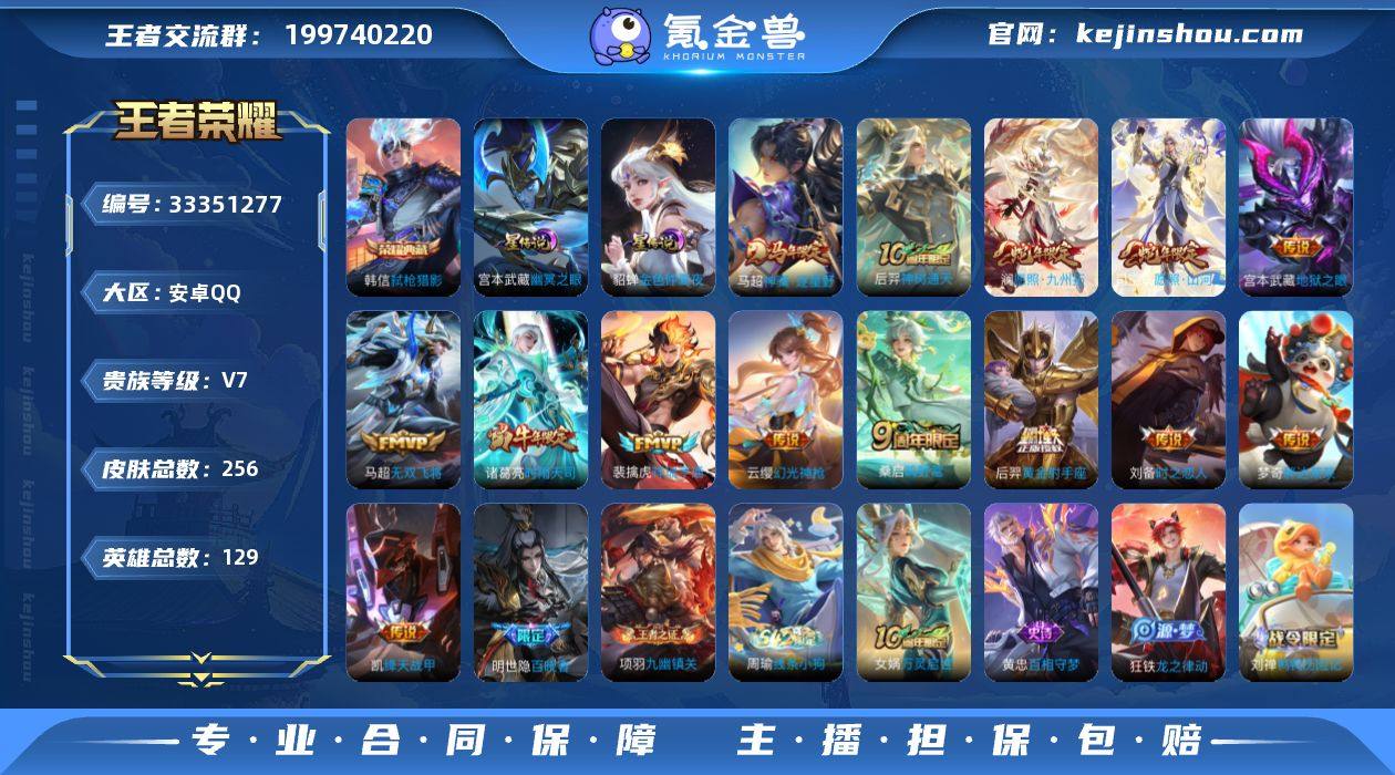 AHC80061 安卓Q-V7-最强王者段位-129英雄-256皮肤-1典藏皮肤-14传说-85史诗 【英雄全皮】:孙权全皮,敖隐全皮,司空震全皮,影全皮 【荣耀典藏】:韩信弑枪猎影 【传说皮肤】:马超神骥逐星野,后羿神树通天,司空震愿照山河定,澜愿照九州拓,云缨幻光神枪,裴擒虎祥瑞亨通,桑启鸣野蒿,马超无双飞将,诸葛亮时雨天司,铠绛天战甲,刘备时之恋人,梦奇胖达荣荣,后羿黄金射手座,宫本武藏地狱之眼 【限定皮肤】:暃埋骨钱,蒙犽顽岩魄,蔡文姬夏日便利店,大乔绒语心约,虞姬夏日便利店,姜子牙天穹之誓,杨戬破阵退雄兵,李白谪仙醉月,狄仁杰阴阳师,赵云皇家上将,嬴政优雅恋人,庄周高山流水,高渐离玩趣恶龙,芈月幻夜卜梦,元歌无心,马可波罗暗影游猎,狄仁杰魔术师,达摩沙漠行僧,项羽海滩派对,韩信傲雪梅枪,王昭君午后时光,兰陵王金庭之子,后羿圣弓游侠,李元芳银河之约,李元芳云中旅人,钟馗驱傩正仪,杨玉环遇见飞天,干将莫邪真爱魔法,鬼谷子五谷丰年,诸葛亮时雨天司,黄忠火炮绅士,铠青龙志,苏烈千军破阵,百里玄策原初追逐者,梦奇顽趣,沈梦溪大漠名商,裴擒虎擒涛扼浪,狂铁电玩高手,猪八戒猪悟能,嫦娥拒霜思,嫦娥暖冬兔眠,鲁班大师探海日...