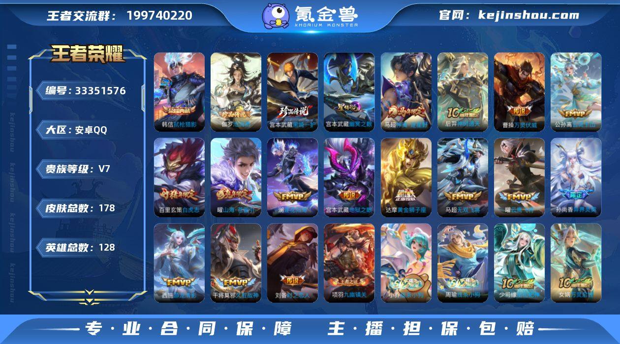 巅峰打野号百星印记7王者印记铭文150级3千紫星币 安卓Q-V7-至尊星耀IV段位-128英雄-178皮肤-1典藏皮肤-2珍品传说-15传说-45史诗 【英雄全皮】:孙权全皮,敖隐全皮,影全皮 【荣耀典藏】:韩信弑枪猎影 【珍品传说】:伽罗沧流箭,宫本武藏黑崎一护 【传说皮肤】:马超神骥逐星野,后羿神树通天,曹操万灵伏威,公孙离云诺千山,澜逐花归海,曜山海苍雷引,马超无双飞将,孙尚香异界灵契,西施游龙清影,曜云鹰飞将,刘备时之恋人,干将莫邪久胜战神,达摩黄金狮子座,百里玄策白虎志,宫本武藏地狱之眼 【限定皮肤】:姜子牙天穹之誓,狄仁杰阴阳师,赵云皇家上将,孙尚香蔷薇恋人,孙尚香异界灵契,元歌云间偶戏,狄仁杰魔术师,达摩沙漠行僧,项羽海滩派对,兰陵王金庭之子,李元芳云中旅人,百里玄策白虎志,百里玄策原初追逐者,沈梦溪大漠名商,裴擒虎李小龙,上官婉儿神器万象笔,嫦娥暖冬兔眠,曜山海苍雷引,鲁班大师探海日志,桑启海盐诗旅,暃星界游侠,艾琳流音漫舞,司空震地狱燃心,阿古朵江河有灵,张良古海寻踪,鬼谷子天穹祈灯,沈梦溪龙舞盛年,项羽苍威无极 【年限皮肤】:百里玄策白虎志,曜山海苍雷引 【赛季限定】:达摩沙漠行僧,兰陵王金庭之子,沈梦...