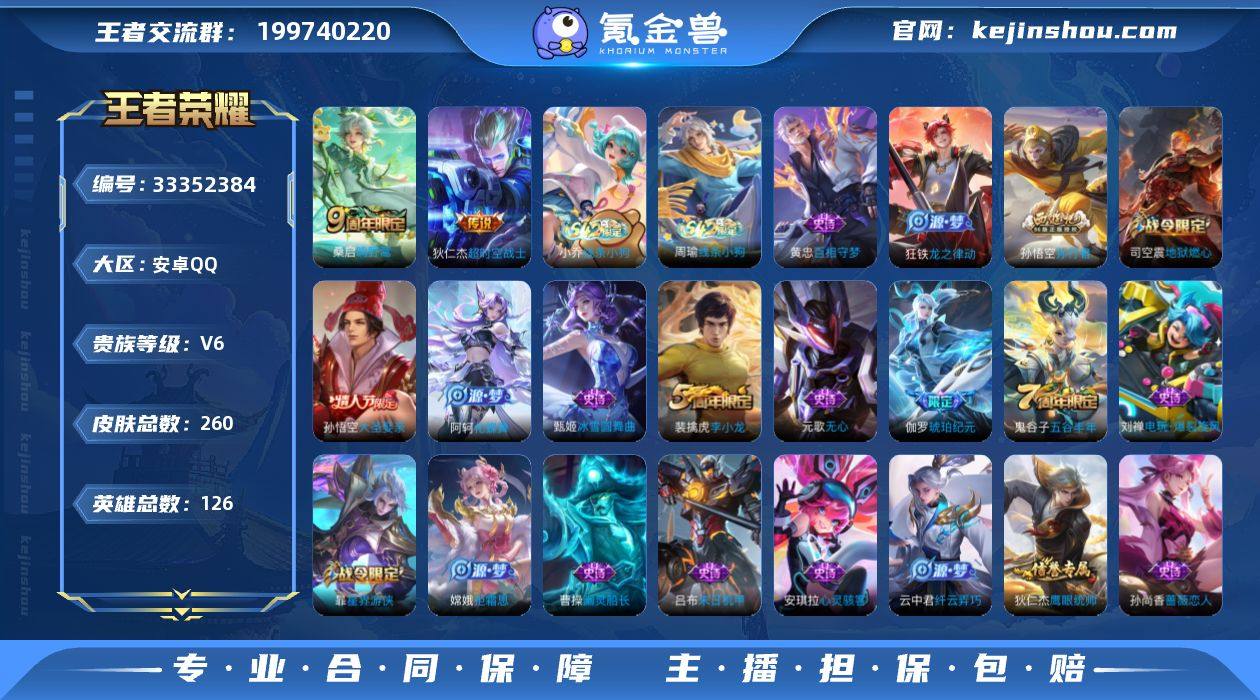 0BC5LT不可二次V6"""260皮肤传说2优质限定3 钱包已注销、信用分正常、无设备脸 传说皮肤:超时空战士-狄仁杰,鸣野蒿, 史诗限定:大圣娶亲,孙行者,琥珀纪元伽罗, 新史诗皮肤:百相守梦-黄忠, 优质史诗皮肤:怒海争锋, 周年皮肤:李小龙,江河有灵,遇见飞天,梁祝,高山流水,五谷丰年, 珍宝阁:蔷薇恋人,女武神, 史诗皮肤:地狱岩魂,圣诞狂欢,末日机甲-吕布,无心,幽灵船长,功夫厨神,猫狗日记-孙策,节奏热浪,鬼剑武藏,暗隐猎兽者,冰冠公主,纤云弄巧,缤纷独角兽,金属风暴,龙骑士,魅力维加斯,摇滚巨星,冰雪圆舞曲,心灵骇客,偶像歌手,黄金分割率,拒霜思,水果甜心,鹰眼统帅,特工魅影,箭羽风息,绅士熊喵,电玩·爆裂旋风,乱世虎臣,乐园奇幻夜, "" " 贵族6 传说皮肤2 史诗皮肤56 皮肤数量260 皮肤价值:148452 英雄126 非凡王者 总场次7119