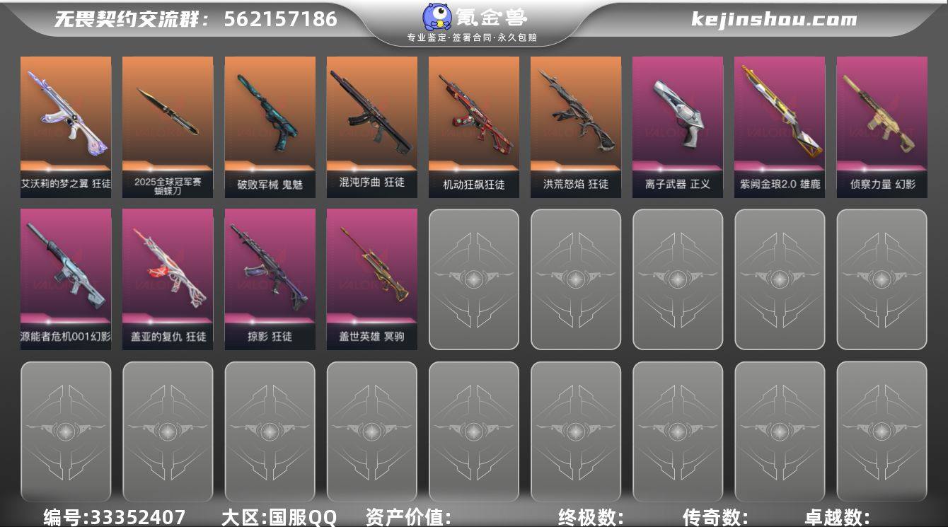 【套装】:2025全球冠军赛套装,VCT 2026 赛季套装,RGX 11z Pro//3.0套装 【英雄】:幻棱,炼狱,维斯,暮蝶,钛狐,壹决,铁臂,捷风,雷兹,幽影,不死鸟,贤者,猎枭,蝰蛇,零,芮娜,奇乐,尚勃勒,霓虹,斯凯,夜露,星礈,K/O,海神,盖可,黑梦,钢锁 【近战武器】:近战武器-2025全球冠军赛 蝴蝶刀,近战武器-VCT 2026 篆刀,近战武器-RGX 11z Pro//3.0 爪刀,近战武器-威龙之刃,近战武器-流星兵团 短剑,近战武器-超能偶像 应援棒,近战武器-超限闪存 匕首,近战武器-机动狂飙 战刀,近战武器-阿特拉斯指挥部 甩棍,近战武器-星际猎兵 短剑 【狂徒】:狂徒-2025全球冠军赛,狂徒-洪荒怒焰,狂徒-混沌序曲,狂徒-机动狂飙,狂徒-塑水宗,狂徒-艾沃莉的梦之翼,狂徒-掠影,狂徒-盖亚的复仇,狂徒-超能偶像,狂徒-流星兵团 【幻影】:幻影-源能者危机001,幻影-侦察力量,幻影-异鳞魔蛇,幻影-超限闪存,幻影-神圣领域,幻影-聚合之力 【戍卫】:戍卫-归零者//2.0,戍卫-超能偶像,戍卫-浮光跃金,戍卫-沙场老兵,戍卫-战术熊与伙伴们,戍卫-月球哨兵 【獠犬】:獠犬-神圣领域,獠犬-采蜜小蜂队,獠犬-模拟赫兹 【冥驹】:冥驹-盖世英雄,冥驹-模拟赫兹 【飞将】:飞...