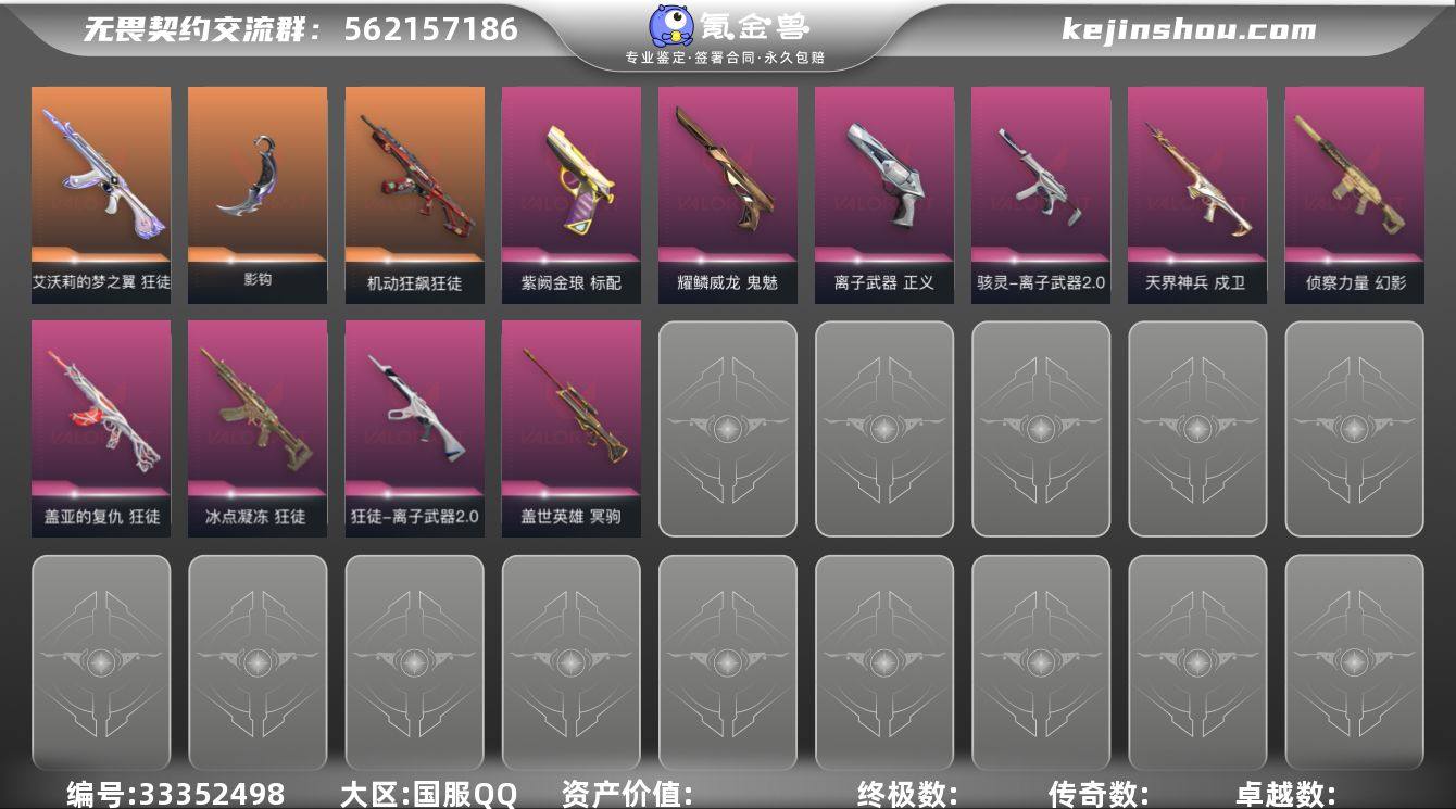 【套装】:掠影//2.0套装,离子武器//2.0套装 【英雄】:幻棱,炼狱,维斯,暮蝶,钛狐,捷风,雷兹,幽影,不死鸟,贤者,猎枭,蝰蛇,零,芮娜,奇乐,尚勃勒,斯凯,K/O,盖可,黑梦,钢锁 【近战武器】:近战武器-碎心裂刃,近战武器-影钩,近战武器-超时空卫队 三棱军刺,近战武器-鬼丸国纲,近战武器-离子武器//2.0 爪刀,近战武器-天玄刀,近战武器-诡秘蛇影 军刀,近战武器-日耀风暴 遗器,近战武器-阿特拉斯指挥部 甩棍,近战武器-星际猎兵 短剑 【狂徒】:狂徒-机动狂飙,狂徒-艾沃莉的梦之翼,狂徒-冰点凝冻,狂徒-盖亚的复仇,狂徒-离子武器//2.0,狂徒-诡秘蛇影 【幻影】:幻影-ORA x 颗秒,幻影-侦察力量,幻影-掠影//2.0,幻影-末日之翼 【戍卫】:戍卫-天界神兵,戍卫-折光棱晶 【冥驹】:冥驹-盖世英雄 【飞将】:飞将-末日之翼 【莽侠】:莽侠-诡秘蛇影 【战神】:战神-离子武器//2.0 【奥丁】:奥丁-掠影//2.0,奥丁-末日之翼 【判官】:判官-诡秘蛇影 【骇灵】:骇灵-离子武器//2.0,骇灵-掠影//2.0 【蜂刺】:蜂刺-折光棱晶 【标配】:标配-紫阙金琅,标配-折光棱晶 【VCT手枪】:标配-VCT26 x BLG,标配-VCT25 x KRÜ 【正义】:正义-离子武器 【鬼魅】...