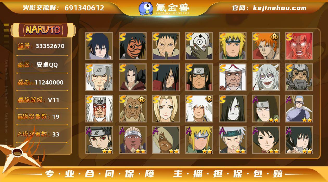 实名: 可修改 贵族等级: V11 S忍数: 19 A忍数: 33 战力值(万): 1124 S级忍者: 千手柱间「秽土转生」,宇智波鼬「秽土转生」,佩恩·天道「超」,药师兜「仙人模式」,宇智波斑「秽土转生」,艾「三代目雷影」,半藏「秽土转生」,千手扉间「秽土转生」,大蛇丸,波风水门,纲手,自来也「仙人模式」,猿飞日斩,迈特凯「死门」,宇智波带土 「忍界大战」,自来也 「舞之豪杰」,宇智波斑「白面具」,神秘面具男 「红夜之刃」,宇智波佐助「永恒万花筒」 通灵兽: 熊猫,二尾又旅