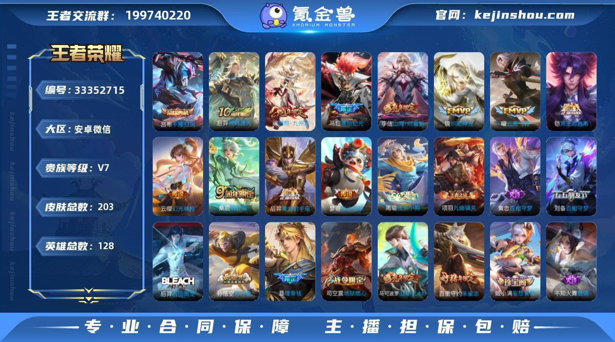 AL699307 【亏本清仓】 皮肤数203 传说皮肤数11 史诗皮肤数69 英雄数128 营地id1880665739 贵族等级【文本】贵族7级 【贵族7级】 【是】 【是】 荣耀典藏1 内测皮肤3 年限皮肤4 限定皮肤68 赛季限定28 史诗皮肤70 战令限定13 勇者皮肤86 其他皮肤35 荣耀典藏:吕布千魇归渊; 内测皮肤:弈星万物之道,姬小满妄想食味,孙尚香蔷薇恋人; 年限皮肤:澜愿照九州拓,李信山海炽霜斩,马可波罗山海玄木吟,百里守约朱雀志; 限定皮肤:曹操逐霄之志,后羿石田雨龙,钟馗虚灵犬护,弈星万物之道,太乙真人谧流熔炉,澜愿照九州拓,牛魔星界战将,东皇太一噬灭天穹,桑启鸣野蒿,杨玉环遇见飞天,百里玄策原初追逐者,蒙犽顽岩魄,暃埋骨钱,铠冥王哈迪斯,姜子牙天穹之誓,刘邦剑破天穹,马超琥珀纪元,姬小满妄想食味,嫦娥漠中幻影,鬼谷子天穹祈灯,蒙恬荣光圣徽,艾琳流音漫舞,司空震地狱燃心,蒙犽百解令,阿古朵江河有灵,张良古海寻踪,西施玲珑珍味,戈娅驭风魔法,雅典娜黎明之约,鲁班大师探海日志,裴擒虎擒涛扼浪,刘备百相守梦,暃星界游侠,李信山海炽霜斩,马可波罗山海玄木吟,桑启海盐诗旅,嫦娥暖冬兔眠,梦奇顽趣,元歌无心,孙悟空孙行者,鬼谷子五谷丰年,李...
