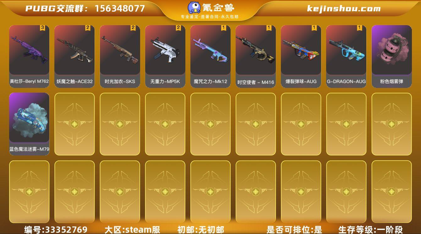 算蓝烟枪粉烟共11个成长级!黑鬼金面发光手臂!丸子头双马尾还有好多!绿战神一套!快手夹克一个!3级美杜莎!权志龙Aug带异色!时光加农2级带异色!k12两把成长!无重力Mp5卡!其他高价值多的很!