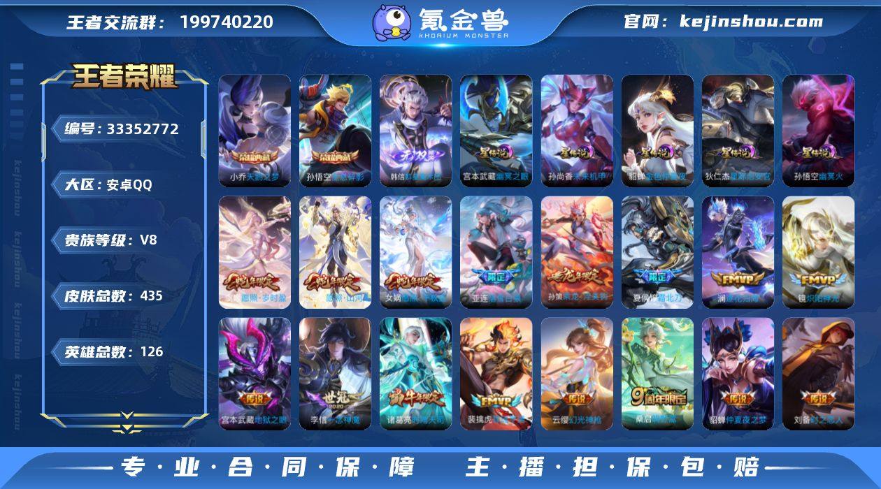 【LWZX223】贵族8/皮肤435/典藏2/传说21/史诗132/英雄125/阿轲全皮/白起全皮/刘邦全皮/钟馗全皮/太乙真人全皮/东皇太一全皮/狂铁全皮/亚连全皮/司空震全皮/戈娅全皮/影全皮/全息碎影/天鹅之梦/韩信群星魔术团/星际治安官/时之恋人-刘备/未来机甲/幽冥火/幽冥之眼/金色仲夏夜/愿照·山河定/愿照·千秋盛/愿照·岁时盈/幻光神枪/祥瑞亨通/鸣野蒿/夏侯惇霜北刀/落雪白狼/乘龙·淬吴钩/澜逐花归海/灼幽烈阳/时雨天司/绛天战甲/炽阳神光/启明星使/一念神魔/仲夏夜之梦/地狱之眼/地狱火/超时空战士-狄仁杰/狰(s8)/蒙犽顽岩魄/蔡文姬夏日便利店/大乔绒语心约/虞姬夏日便利店/天穹之誓(s36)/破阵·退雄兵/阴阳师/凯尔特女王(s7)/皇家上将/神迹守卫-墨子/优雅恋人/白昼王子/蔷薇恋人/狮舞东方/高山流水/死亡摇滚/迷踪丽影/超时空战士-钟无艳/奇幻香踪/夜都怪侠/重明(s11)/幻夜卜梦/猎兽之王/御风骁将/赤莲之焰/云间偶戏/无心/朔风刀(s17)/游园惊梦/落雪兰心/烛龙(s10)/穷奇(s12)/蓝屏警告/暗影游猎/山海·玄木吟/魔术师/万华元夜(s22)/星际陆战队-达摩/沙漠行僧(s26)/海滩派对/醍醐杖(s20)/航海奇遇记/冰锋战神/魔法小厨娘/演武夺筹(s23)/夺宝奇兵/午后时光/驯魔猎人/金庭之子(s27)/潮玩骑士...