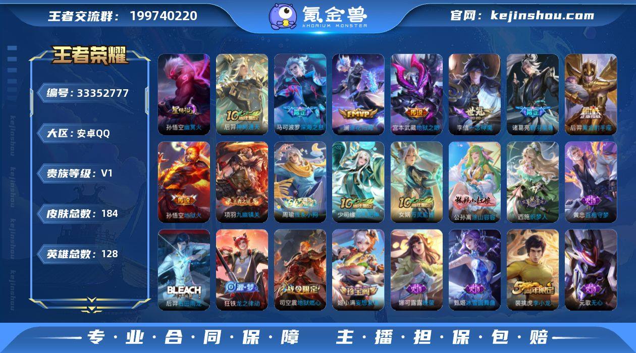【特价出售/店主推荐】安卓Q-V1-永恒钻石I段位-128英雄-184皮肤-1星传说-8传说-49史诗 【英雄全皮】:孙权全皮 【传说皮肤】:后羿神树通天,澜逐花归海,诸葛亮鹤羽星尊,马可波罗深海之息,李信一念神魔,后羿黄金射手座,宫本武藏地狱之眼,孙悟空地狱火 【限定皮肤】:姜子牙天穹之誓,狄仁杰阴阳师,赵云皇家上将,孙尚香蔷薇恋人,高渐离死亡摇滚,元歌无心,甄姬游园惊梦,马可波罗深海之息,狄仁杰魔术师,狄仁杰万华元夜,达摩沙漠行僧,项羽海滩派对,老夫子醍醐杖,程咬金演武夺筹,兰陵王金庭之子,李元芳云中旅人,钟馗驱傩正仪,雅典娜黎明之约,鬼谷子原初探秘者,鬼谷子五谷丰年,诸葛亮鹤羽星尊,苏烈千军破阵,百里玄策原初追逐者,梦奇顽趣,沈梦溪大漠名商,裴擒虎李小龙,裴擒虎擒涛扼浪,云中君纤云弄巧,鲁班大师探海日志,桑启海盐诗旅,艾琳流音漫舞,司空震地狱燃心,阿古朵江河有灵,张良古海寻踪,蒙犽百解令,蒙恬荣光圣徽,高渐离燃音魔法,妲己灵卜魔法,鬼谷子天穹祈灯,姬小满妄想食味,刘邦剑破天穹,程咬金群星魔术团,周瑜熔金海岸 【赛季限定】:老夫子醍醐杖,鬼谷子原初探秘者,狄仁杰万华元夜,程咬金演武夺筹,钟馗驱傩正仪,苏烈千...