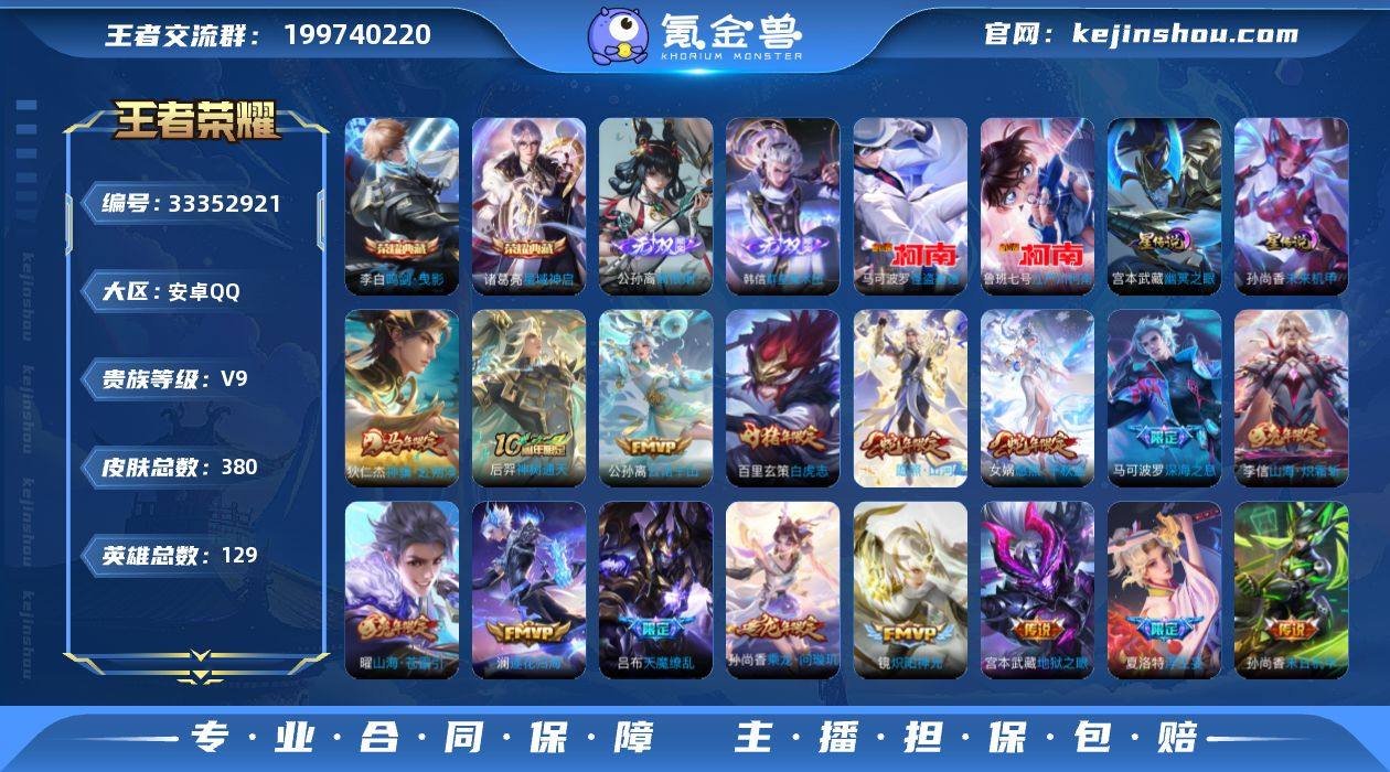 【特价出售/店主推荐/不包人脸/腾讯游戏信誉分较低】发育路44段、打野33段,安卓Q-V9-至尊星耀II段位-129英雄-380皮肤-2典藏皮肤-2无双-2珍品传说-2星传说-43传说-107史诗 【英雄全皮】:孙权全皮,娜可露露全皮,橘右京全皮,刘备全皮,苍全皮,敖隐全皮,司空震全皮,戈娅全皮 【荣耀典藏】:李白鸣剑曳影,诸葛亮星域神启 【无双皮肤】:公孙离离恨烟,韩信群星魔术团 【珍品传说】:鲁班七号江户川柯南,马可波罗怪盗基德 【传说皮肤】:狄仁杰神骥赴朔漠,后羿神树通天,公孙离云诺千山,司空震愿照山河定,女娲愿照千秋盛,云缨幻光神枪,王昭君映山客,桑启鸣野蒿,云中君群星魔术团,貂蝉曦玄引,孙尚香乘龙问璇玑,赵云乘龙铭钟鼎,澜逐花归海,露娜霜月吟,马可波罗妄想实况,诸葛亮鹤羽星尊,夏洛特浮生妄,虞姬无限倾心,项羽无限倾心,孙悟空齐天大圣,曜山海苍雷引,李信山海炽霜斩,吕布怒海麟威,狄仁杰神器狴犴令,橘右京枫霜尽,娜可露露前尘镜,马可波罗深海之息,马超无双飞将,兰陵王默契交锋,镜炽阳神光,虞姬启明星使,李信一念神魔,刘备时之恋人,张良黄金白羊座,干将莫邪久胜战神,百里玄策白虎志,花木兰冠军飞将,后羿黄金射手座,孙尚香末日机...