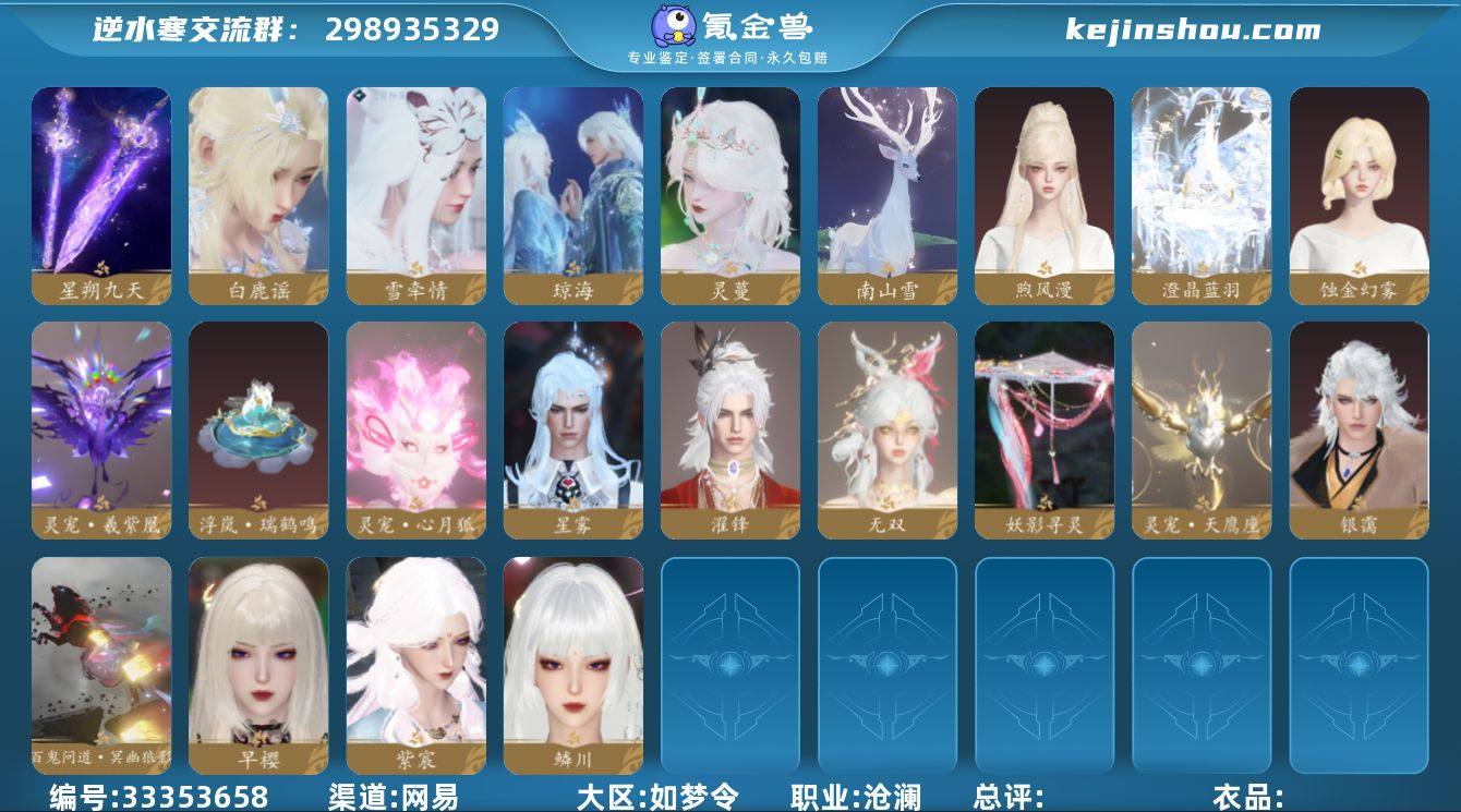 【已用天赏石28】战力值:1295415 总评:1295415 角色等级:89 衣品值: 255915 国色值: 32130 已用天赏石:28 【网易邮箱账号】 【无换绑冷却】 【沧澜】 【女】 【6级】 【互通】 副本外观4 天赏外观18 天赏祥瑞2 天赏灵宠3 武器环身1 副本外观:白夜拂雪,紫宿宸极,星落月皓,飞焰流波; 天赏外观:早樱,煦风漫,蚀金幻雾,银霭,灵蔓,濯锋,琼海,星雾,雪牵情,无双,白鹿谣,鳞川,紫宸,浮岚·瑞鹤鸣,蝴蝶武器,星辰武器,妖影寻灵·狐舞青丘,绝技百鬼问道·冥幽狼影; 天赏祥瑞:澄晶蓝羽,南山雪; 天赏灵宠:灵宠·心月狐,灵宠·羲紫凰,灵宠·天鹰座; 武器环身:赤焰流光;