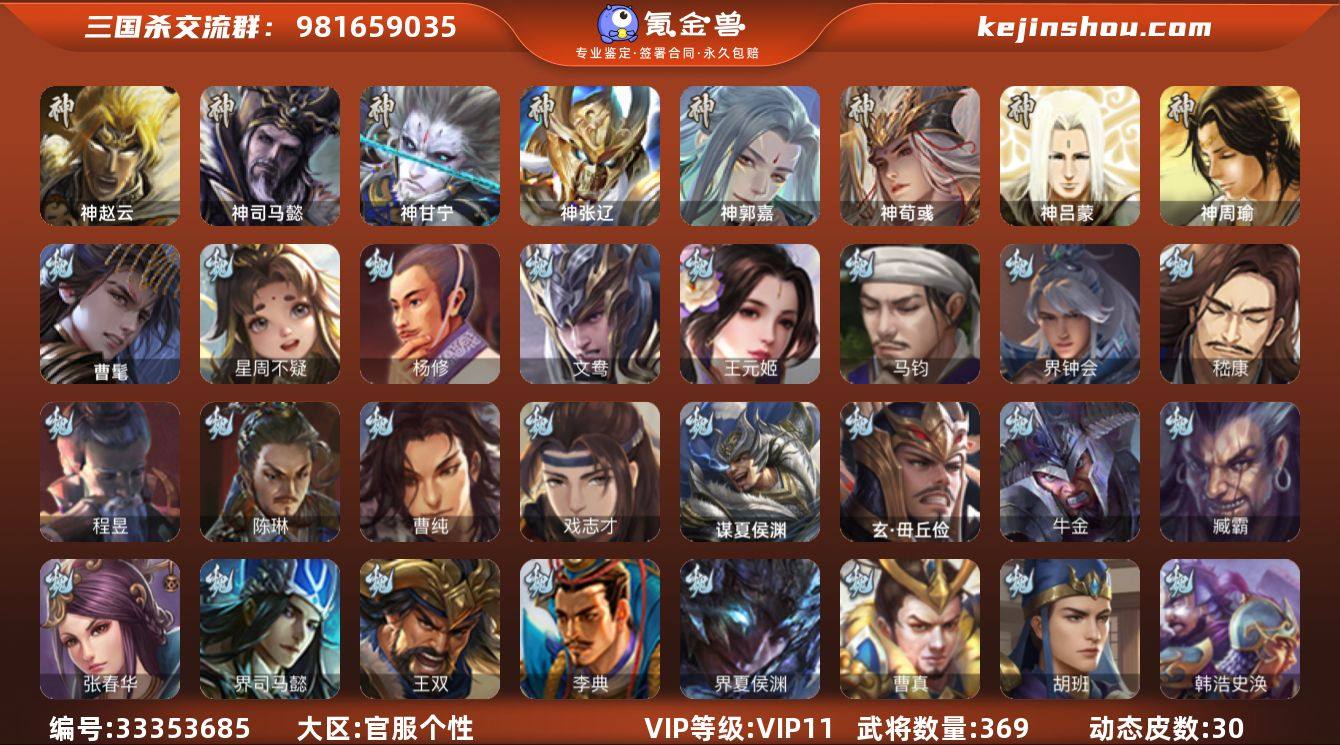 【JYSGS100】官阶:大将军;VIP等级:VIP11;史诗武将数量:42;动态皮肤数量:30;武将总数:369;史诗宝珠数量:0;将魂数量:3591;神将:6;魏国史诗武将:14;蜀国史诗武将:5;吴国史诗武将:9;群史诗武将:12 神赵云,神司马懿,神甘宁,神张辽,神郭嘉,神荀彧,曹髦,星周不疑,杨修,王元姬,马钧,界钟会,嵇康,陈琳,曹纯,戏志才,程昱,关索,谋赵云,谯周,花鬘,谋关羽,张奋,孙寒华,骆统,留赞,界徐盛,界步练师,贺齐,文鸯,十常侍,左慈,张让,杨彪,麹义,刘焉,沮授,界李儒,公孙康,杜预,谋张角,兀突骨,神吕蒙,神周瑜,SP关羽,SP曹仁,SP蔡文姬,乐进,曹昂,诸葛诞,朱灵,文聘,SP姜维,张春华,钟会,曹冲,郭淮,满宠,界王异,界曹操,界司马懿,界夏侯惇,界张辽,界许褚,界郭嘉,李典,曹真,韩浩史涣,陈群,曹叡,曹休,钟繇,司马朗,李通,郭皇后,孙资刘放,辛宪英,界甄姬,吕虔,鲁芝,蒯越蒯良,界典韦,界荀彧,界徐晃,杜畿,界曹丕,毌丘俭,界邓艾,张恭,界曹植,界曹彰,界郭淮,卞夫人,辛毗,华歆,蔡贞姬,袁涣,王双,崔琰,毛玠,杨阜,阮慧,牵招,胡班,玄毌丘俭,文钦,谋夏侯渊,牛金,界夏侯渊,臧霸,SP孙尚香,关银屏,夏侯霸,马良,关兴张苞,廖化,界马岱,关平,简雍,刘封,界法正,界关兴张苞,界刘备,界关羽,界张飞,界赵云,界马超,SP徐庶,...