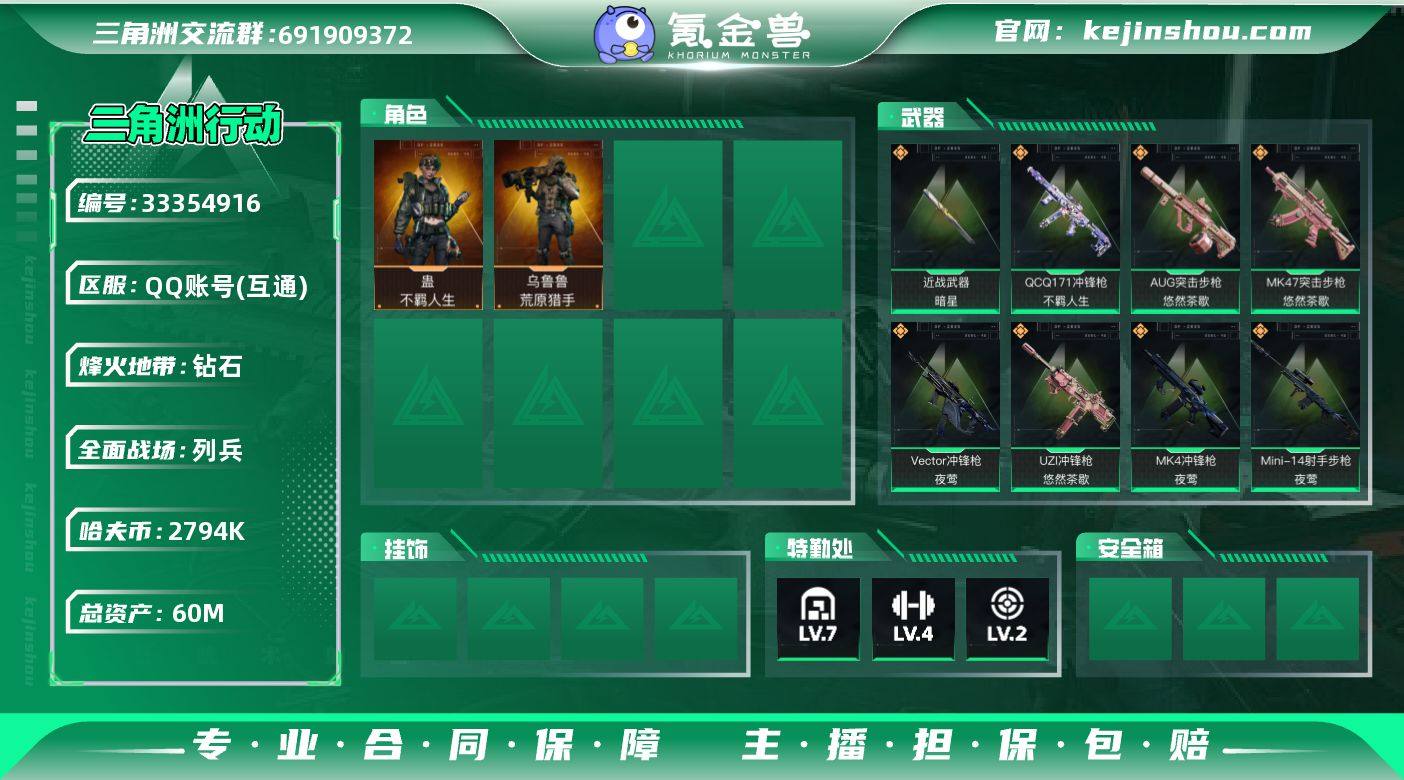 【SJ9887】总资产60M/哈夫币279万/传说近战数1/传说枪皮数17/战场等级23/行动等级60/安全箱等时效性道具以游戏内数据为准,详情请看图/乌鲁鲁-荒原猎手/蛊-不羁人生/近战-暗星/近战-黑鹰/AKM突击步枪-锦绣/K416突击步枪-行动记录/AUG突击步枪-悠然茶歇/腾龙突击步枪-万金泪冠/K437突击步枪-锦绣/KC17突击步枪-电锯惊魂/MK47突击步枪-悠然茶歇/Vector冲锋枪-夜莺/UZI冲锋枪-悠然茶歇/SMG-45冲锋枪-锦绣/勇士冲锋枪-万金泪冠/QCQ171冲锋枪-不羁人生/MK4冲锋枪-夜莺/Mini-14射手步枪-夜莺/M14射手步枪-蛮荒/SKS射手步枪-骑士/AWM狙击步枪-万金泪冠/勇士冲锋枪-檀劫铳影/K416突击步枪-冬日风情/K416突击步枪-腊梅/K416突击步枪-阿萨拉特攻/SG552突击步枪-哈夫克警备/SCAR-H战斗步枪-囚徒/K437突击步枪-丛林谍踪/MP5冲锋枪-深海恐惧/Vector冲锋枪-猎鳄行动/SMG45冲锋枪-阿萨拉特攻/SR-3M紧凑突击步枪-开工大吉/勇士冲锋枪-丛林谍踪/MP7冲锋枪-六套之力/PKM通用机枪-阿萨拉特攻/M249轻机枪-丛林谍踪/QJB201轻机枪-炽焰/VSS射手步枪-丛林谍踪/SVD狙击步枪-阿萨拉工艺/M14射手步枪-工业狂潮/M14射手步枪-航天庆典/SV-98狙击步枪-囚徒/M700狙击步枪-蝮蛇/沙漠之鹰-曙光/MP5冲锋枪-星之...