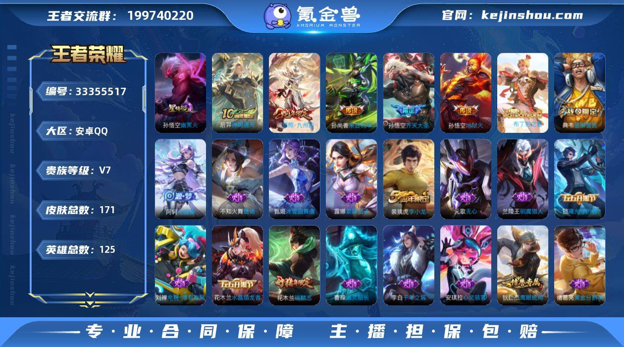【c4315】澜蛇年限定!齐天大圣!地狱火!300多朵花!安卓Q-V7【特价出售,永久包赔】-永恒钻石IV段位-125英雄-170皮肤-5传说-41史诗 【传说皮肤】:后羿神树通天,澜愿照九州拓,孙悟空齐天大圣,孙尚香末日机甲,孙悟空地狱火 【限定皮肤】:姜子牙天穹之誓,狄仁杰阴阳师,赵云皇家上将,嬴政优雅恋人,嬴政白昼王子,鲁班七号狮舞东方,高渐离死亡摇滚,吕布猎兽之王,周瑜赤莲之焰,元歌无心,夏侯惇朔风刀,典韦蓝屏警告,狄仁杰魔术师,狄仁杰万华元夜,达摩沙漠行僧,项羽海滩派对,老夫子醍醐杖,程咬金演武夺筹,兰陵王驯魔猎人,花木兰瑞麟志,孙悟空齐天大圣,牛魔御旌,李元芳云中旅人,钟馗神迹守卫,钟馗驱傩正仪,女娲朔望之晖,太乙真人华丽摇滚,鬼谷子原初探秘者,百里玄策原初追逐者,弈星混沌棋,沈梦溪大漠名商,明世隐疑决卦,裴擒虎李小龙,裴擒虎擒涛扼浪,米莱狄御霄,盾山御銮,上官婉儿梁祝,鲁班大师探海日志,桑启海盐诗旅,张良古海寻踪,蒙犽百解令,蒙恬荣光圣徽,鬼谷子天穹祈灯,刘邦剑破天穹 【年限皮肤】:花木兰瑞麟志,澜愿照九州拓 【赛季限定】:米莱狄御霄,牛魔御旌,盾山御銮,夏侯惇朔风刀,弈星混沌棋,明世隐疑决卦,老夫子醍...