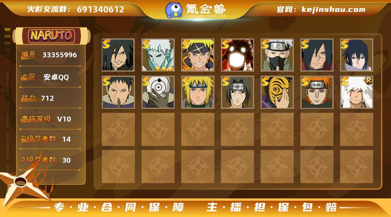 实名: 可修改 贵族等级: V10 S忍数: 14 A忍数: 30 战力值(万): 712 S级忍者: 神秘面具男,佩恩「天道」,波风水门,宇智波鼬 「须佐能乎」,宇智波带土 「忍界大战」,自来也 「舞之豪杰」,宇智波斑「白面具」,宇智波佐助「永恒万花筒」,宇智波斑「秽土转生·解」,旗木卡卡西「须佐能乎」,漩涡鸣人 「暴怒·第六尾」,漩涡鸣人·宇智波佐助,宇智波带土「十尾人柱力」,宇智波斑「神驹佑将」 通灵兽: 熊猫 亮点: 【优质装备】:熊猫,神秘面具男,宇智波带土 「忍界大战」,宇智波斑「白面具」,宇智波佐助「永恒万花筒」,宇智波斑「秽土转生·解」,旗木卡卡西「须佐能乎」,漩涡鸣人 「暴怒·第六尾」