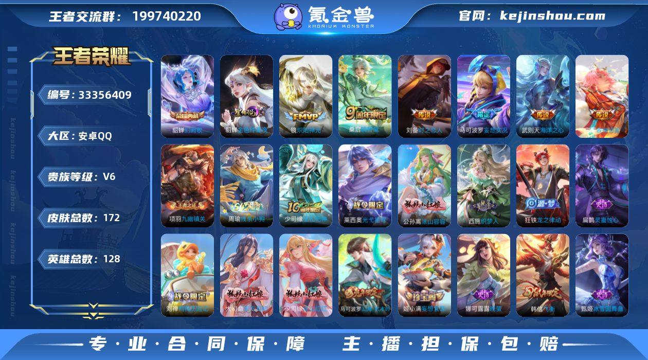 W15985,,可立即换绑无需挂单养号,,有限制令,,铭文满级,,典藏1,,传说6,,星传说1,,按键4,,,夺宝99,,安卓Q-V6-至尊星耀IV段位-128英雄-172皮肤-1典藏皮肤-6传说-55史诗 【英雄全皮】:少司缘全皮 【荣耀典藏】:貂蝉幻阙歌 【传说皮肤】:桑启鸣野蒿,庄周牧神诗旅,马可波罗妄想实况,镜炽阳神光,刘备时之恋人,武则天海洋之心 【限定皮肤】:蔡文姬夏日便利店,虞姬夏日便利店,姜子牙天穹之誓,李白谪仙醉月,狄仁杰阴阳师,赵云皇家上将,孙尚香蔷薇恋人,元歌无心,马可波罗山海玄木吟,马可波罗妄想实况,狄仁杰魔术师,达摩沙漠行僧,项羽海滩派对,老夫子醍醐杖,程咬金演武夺筹,韩信飞衡,兰陵王金庭之子,李元芳银河之约,李元芳云中旅人,钟馗驱傩正仪,杨玉环遇见飞天,鬼谷子原初探秘者,鬼谷子五谷丰年,苏烈千军破阵,沈梦溪大漠名商,裴擒虎李小龙,裴擒虎擒涛扼浪,桑启海盐诗旅,艾琳流音漫舞,鬼谷子天穹祈灯,姬小满妄想食味,沈梦溪龙舞盛年,刘邦剑破天穹,程咬金群星魔术团,周瑜熔金海岸 【年限皮肤】:韩信飞衡,马可波罗山海玄木吟 【赛季限定】:老夫子醍醐杖,鬼谷子原初探秘者,程咬金演武夺筹,钟馗驱傩正仪,苏烈千军破阵,...