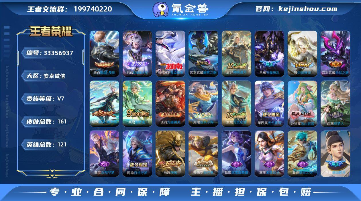 【c4323】打野27段!李白典藏!韩信无双!马可珍品!安卓WX-V7【特价出售,永久包赔】-永恒钻石IV段位-121英雄-161皮肤-1典藏皮肤-1无双-1珍品传说-6传说-52史诗 【英雄全皮】:孙权全皮 【荣耀典藏】:李白鸣剑曳影 【无双皮肤】:韩信群星魔术团 【珍品传说】:马可波罗怪盗基德 【传说皮肤】:后羿神树通天,桑启鸣野蒿,赵云乘龙铭钟鼎,镜炽阳神光,宫本武藏地狱之眼,吕布天魔缭乱 【限定皮肤】:姜子牙天穹之誓,李白谪仙醉月,狄仁杰阴阳师,赵云皇家上将,嬴政优雅恋人,吕布天魔缭乱,狄仁杰魔术师,达摩沙漠行僧,项羽海滩派对,兰陵王金庭之子,孙悟空孙行者,百里玄策原初追逐者,鲁班大师探海日志,桑启海盐诗旅,蒙恬荣光圣徽,鬼谷子天穹祈灯,赵云乘龙铭钟鼎,沈梦溪龙舞盛年,鲁班七号蔬乡物语,李元芳蔬乡物语,刘邦剑破天穹,程咬金群星魔术团,韩信群星魔术团,关羽决胜骁骑 【年限皮肤】:赵云乘龙铭钟鼎 【赛季限定】:达摩沙漠行僧,兰陵王金庭之子,桑启海盐诗旅,鲁班大师探海日志,鬼谷子天穹祈灯,刘邦剑破天穹,姜子牙天穹之誓,东皇太一噬灭天穹,太乙真人谧流熔炉,钟馗虚灵犬护,甄姬逆浪荇歌,亚瑟荣光之誓,百里玄策原初追逐者,蒙恬荣光圣...