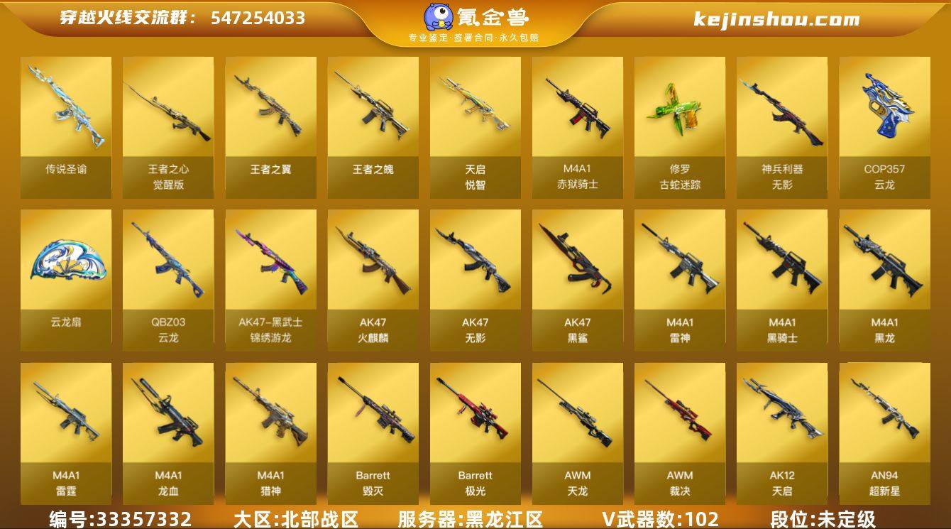 黑龙江区-110V-8王者武器数-0炫金武器数 【传说武器】:传说圣谕 【热门武器】:传说圣谕,QBZ03-金色蔷薇,Scar Light-白虎,修罗-古蛇迷踪,死亡之眼,QBZ03-街机,毒蜂,M4A1-黑骑士,汤姆逊-烈龙*6,RPK-盘龙*4,加特林-炼狱*3,USP-雷暴,沙鹰-修罗*4,炽芒蝶刃 【王者炫金武器】:天启-悦智,王者之翼,王者之魄 【音效卡】:AK47-火麒麟音效卡,M4A1-雷神音效卡,M4A1-黑骑士音效卡,Barrett-毁灭音效卡,AWM-裁决音效卡,枪娘语音包-凯萨林 【皮肤】:幻神-Heartshot 皮肤,雷神-暗月,雷神-能量核心,雷神-R.LGD-CFPLS18冠军,炼狱-星空,炼狱-奇幻宇宙万象,火麒麟-雷神,毁灭-冠军之怒,毁灭-虹光风暴 皮肤,黑龙-能量核心,黑骑士-暗月,无影-能量核心,天龙-秘银,天龙-能量核心,AWM-天龙-传奇白鲨,极光-能量核心,修罗-能量核心,天神-暗月*2,轻型军用手斧-再燃火线 【角色】:零,樱,魅影,炫,审判者,战地猎狐,王者晴雅,雪域霜狐,蛇隐宗,修道士,斗烈龙骑,初恋灵狐,芳心审判者,飞虎队-X,风暴女,嘉年华灵狐,兰-海滩派对,猎狐者-追月,灵狐者-X,灵狐者-黄金海岸,潘多拉-X,蛇姬,铁骑荣耀,影武者-X 【人偶武器】:斯泰尔-枪娘暗刃,MAC-10-...