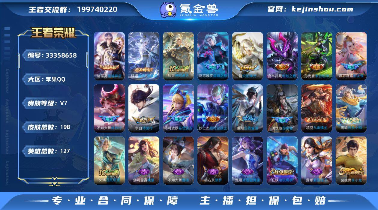 实名: 可修改 性别: 男号 贵族等级: V7 英雄数: 127 皮肤数: 198 荣耀水晶: 星域神启 珍品传说: 器灵·落星盏 传说皮: 炽阳神光,云霓雀翎,末日机甲-孙尚香,地狱之眼,超时空战士-狄仁杰,妄想实况,神树通天 限定皮: 遇见飞天,李小龙,深海之息,前尘镜,五谷丰年,绯月行,诗剑行,陌上桑 亮点: 【优质装备】:星域神启(倪克斯贼亮),器灵·落星盏,炽阳神光,云霓雀翎,末日机甲-孙尚香(绿蚂蚱),地狱之眼,超时空战士-狄仁杰,妄想实况