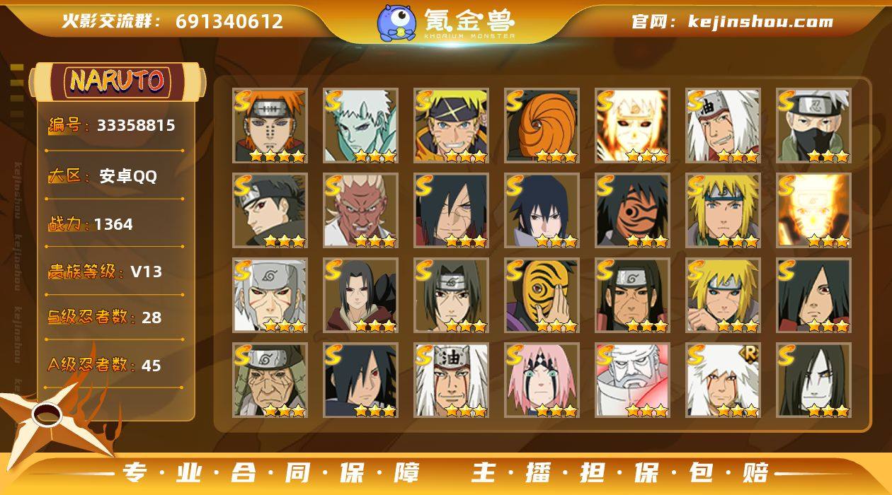 【HYC1824】VIP等级V13/战力1364W/S忍数量28/A忍数量45/三星S-波风水门「九喇嘛连结」/三星S-宇智波带土「十尾人柱力」/二星A-宇智波止水/五星A-猿飞阿斯玛/三星S-旗木卡卡西「须佐能乎」/2星小南「神驹佑将」/三星S-宇智波斑/三星S-猿飞日斩「秽土转生」/二星A-照美冥「五代目水影」/二星A-猿飞阿斯玛「秽土转生」/五星A-迈特凯/三星S-自来也/三星S-千手扉间「秽土转生」/二星A-神秘面具男 「忍者之路」/2星旗木卡卡西「神威对决」/二星A-长十郎「六代目水影」/二星A-蝎「绯流琥」/二星A-桃地再不斩「秽土转生」/二星A-春野樱「百豪」/三星S-自来也 「传说中的三忍」/二星A-宇智波带土「暴怒」/二星A-黑土「四代目土影」/二星A-迪达拉「秽土转生」/二星A-药师兜「半蛇斗篷」/二星A-神农 「羁绊」/三星A-飞段「死司凭血」/三星S-春野樱 「忍界大战」/二星A-宇智波佐助「万花筒写轮眼」/二星A-我爱罗「忍界大战」/二星A-迪达拉/四星A-我爱罗「疾风传」/二星A-小南/二星A-漩涡鸣人「九尾查克拉」/二星A-猿飞木叶丸「博人传」/三星S-神秘面具男/二星A-大蛇丸「晓」/二星A-日向宁次·忍界大战/二星A-宇智波鼬/三星S-宇智波佐助「永恒万花筒」/三星S-大筒木金式「博人传」/三星S-宇...