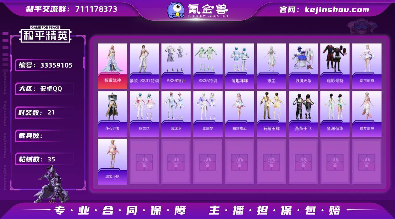 【和平精英】1粉装,4特效枪,1载具,历史最高段位:传奇王牌13星 王牌印记3次 热力值:20843,43套装,75枪械,66装备,53战备;套装:角色-智耀战神,套装-长空猛禽,套装-海岛探路者,套装-冷焰舞者,套装-浪漫天命,套装-沙漠毒蛇,套装-狂沙舞者,套装-暗影哥特,套装-缤纷果语,套装-冰川特警,套装-破蛋小黄鸡,套装-战术大师,套装-萌趣咩咩,套装-光之冒险,套装-恋语绒绒,套装-老实芭蕉,角色-银尘,套装-街头风暴,套装-净心行者,角色-都市丽猫,套装-星途旅人,角色-糖霜甜心,套装-绿洲幻境,套装-SS30特训,套装-绒宝小鹅,套装-SS31特训,套装-鱼渊荷华,套装-石蕴玉辉,套装-燕燕于飞,套装-智谋强哥,角色-瑰梦爱神,套装-紫幽梦,套装-粉恋花,套装-SS33特训,套装-巳巳如意,套装-SS32特训,套装-蓝冰羽,套装-大橘大利,套装-SS34特训,套装-SS35特训,套装-SS37特训,套装-SS36特训,套装-SS38特训;枪皮:ACE32-蓝晶绮麟,ACE32-冰晶雪宝,GROZA-绿洲幻境,SCAR-L-红色方程式,SCAR-L-夜灯,SCAR-L-玉兔迎春,5级AUG-暖羊咩咩,AUG-耀粉歌者,AUG-金蛇镇世,M762-彩虹符号,M416-仓鼠灰灰,M416-绿洲时空,Famas-乌木金纹,AKM-砺玉逐花,G36C-星穹咏叹...