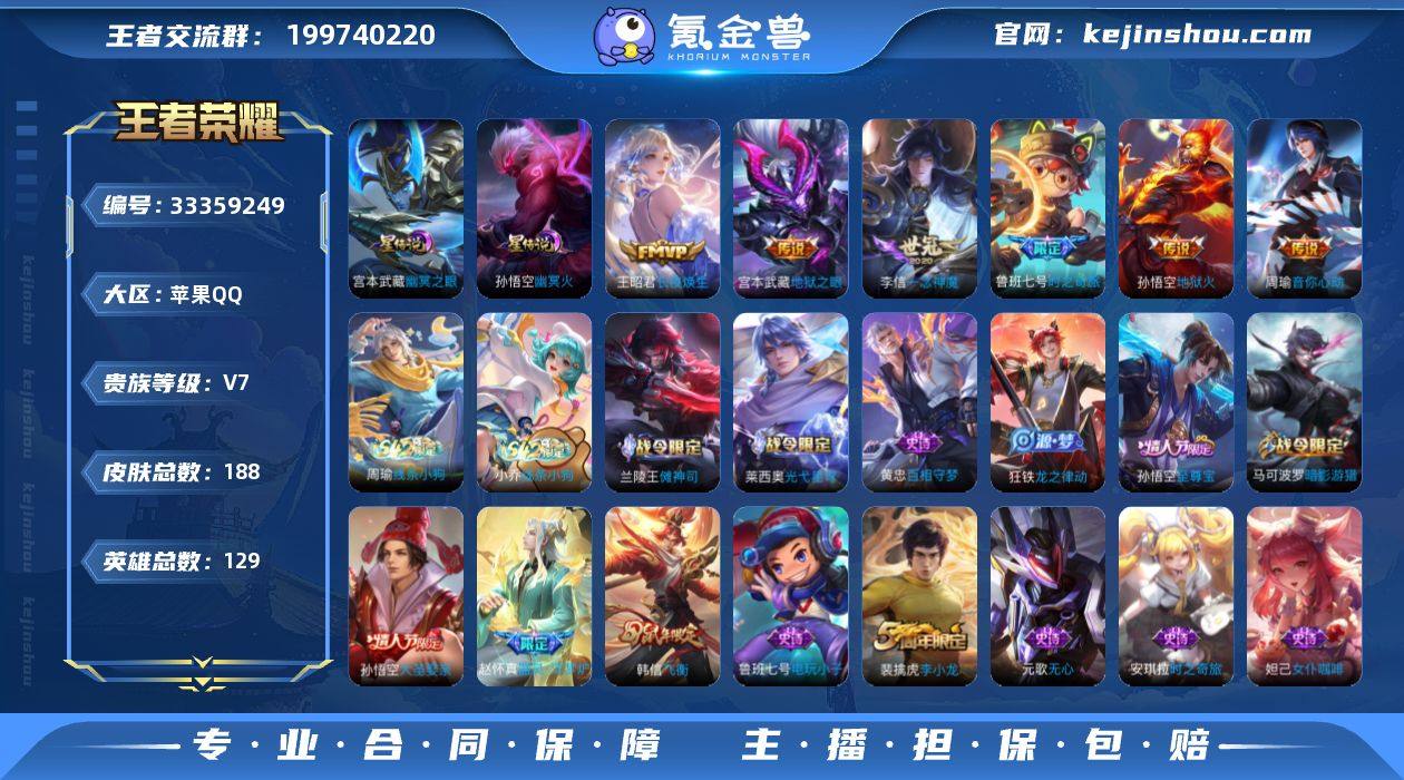 【WZ182336】苹果Q-V7-至尊星耀V段位-129英雄-188皮肤-7传说-38史诗【英雄全皮】:孙权全皮,敖隐全皮,空空儿全皮【传说皮肤】:韩信踏浪归,王昭君长夜焕生,鲁班七号时之奇旅,周瑜音你心动,李信一念神魔,宫本武藏地狱之眼,孙悟空地狱火【限定皮肤】:狄仁杰阴阳师,赵云皇家上将,嬴政白昼王子,鲁班七号时之奇旅,阿轲迷踪丽影,吕布猎兽之王,元歌无心,夏侯惇朔风刀,马可波罗暗影游猎,狄仁杰魔术师,狄仁杰万华元夜,达摩沙漠行僧,项羽海滩派对,老夫子醍醐杖,程咬金演武夺筹,刘邦夺宝奇兵,韩信飞衡,兰陵王金庭之子,孙悟空至尊宝,孙悟空大圣娶亲,牛魔御旌,李元芳匿光侦查者,李元芳云中旅人,钟馗驱傩正仪,干将莫邪胡桃夹子,蔡文姬繁星吟游,鬼谷子原初探秘者,弈星混沌棋,沈梦溪大漠名商,明世隐疑决卦,裴擒虎李小龙,裴擒虎擒涛扼浪,狂铁御狮,米莱狄御霄,云中君纤云弄巧,盾山御銮,猪八戒西部大镖客,上官婉儿梁祝,鲁班大师探海日志,桑启海盐诗旅,鬼谷子天穹祈灯【年限皮肤】:韩信飞衡【赛季限定】:狂铁御狮,米莱狄御霄,牛魔御旌,盾山御銮,夏侯惇朔风刀,弈星混沌棋,明世隐疑决卦,老夫子醍醐杖,鬼谷子原初探秘者,狄仁杰万华元夜...