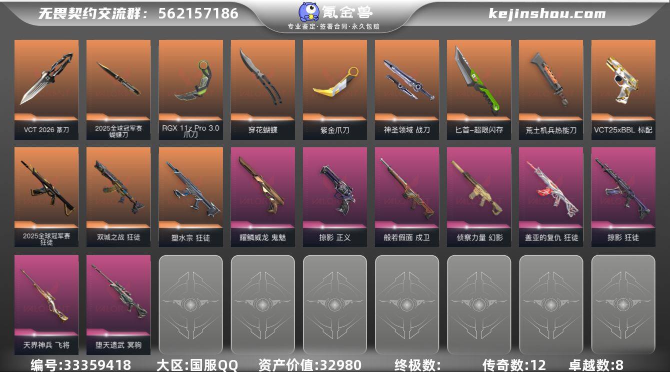 段位: 黄金 套装: 2025全球冠军赛 近战武器皮肤: 紫金爪刀-紫阙金琅//2.0,爪刀-RGX 11z Pro 3.0,匕首-超限闪存,荒土机兵热能刀,穿花蝴蝶-黑市,神圣领域 战刀,2025全球冠军赛 蝴蝶刀,VCT 2026 篆刀 步枪皮肤: 狂徒-盖亚的复仇,幻影-侦察力量,狂徒-塑水宗,戍卫-般若假面,狂徒-掠影,狂徒-双城之战,2025全球冠军赛 狂徒 佩枪皮肤: 鬼魅-耀鳞威龙,正义-掠影,标配-VCT25xBBL 狙击枪皮肤: 飞将-天界神兵,冥驹-堕天遗武 亮点: 【优质装备】:2025全球冠军赛,2025全球冠军赛 蝴蝶刀,狂徒-塑水宗,狂徒-掠影,狂徒-盖亚的复仇,幻影-侦察力量,冥驹-堕天遗武,正义-掠影,飞将-天界神兵,紫金爪刀,爪刀-RGX 11z Pro 3.0,匕首-超限闪存,荒土机兵热能刀,穿花蝴蝶,神圣领域 战刀,戍卫-般若假面,鬼魅-耀鳞威龙,2025全球冠军赛 狂徒