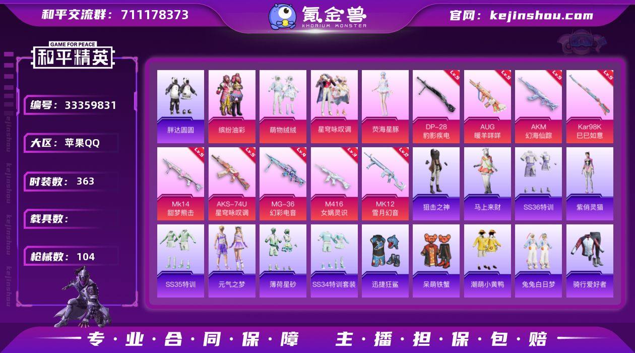 实名: 可修改 时装数: 363 枪械数: 104 热门装扮: 呆萌铁蟹,迅捷狂鲨,缤纷油彩,潮萌小黄鸭,胖达圆圆,兔兔白日梦,萌物绒绒,星穹咏叹调,荧海星豚 稀有枪皮: Kar98K-巳巳如意,M416-女娲灵识,AUG-暖羊咩咩,MK12-雪月幻音,AKM-幻海仙踪,AKS-74U-星穹咏叹调,MK14-甜梦熊击,MG-36-幻彩电音,DP-28-豹影疾电 亮点: 【优质装备】:暗影哥特(红眼罩),萌熊伴侣背包(粉熊背包),缤纷油彩(猪妹猪脸妹)