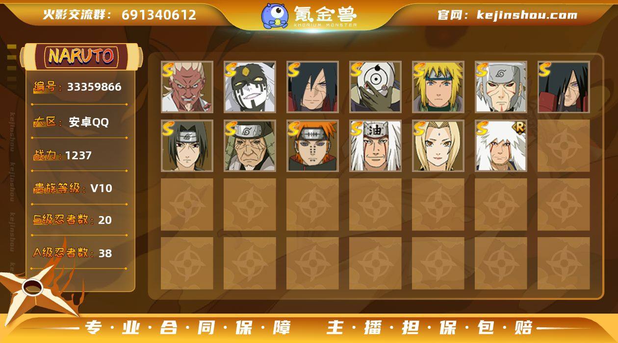 V10 20S忍 38A忍 20通灵 1237.2W战力 可二次 可修改实名 【S级忍者】艾「忍界大战」,大筒木桃式,宇智波斑「秽土转生·解」,自来也 「舞之豪杰」,旗木卡卡西「须佐能乎」,自来也 「传说中的三忍」,漩涡鸣人 「暴怒·第六尾」,波风水门「九喇嘛连结」,宇智波斑「五影会谈」,漩涡鸣人·宇智波佐助,宇智波带土「十尾人柱力」,宇智波斑「秽土转生」,宇智波斑「白面具」,千手扉间「秽土转生」,猿飞日斩「秽土转生」,宇智波鼬 「须佐能乎」,佩恩「天道」,波风水门,自来也,纲手