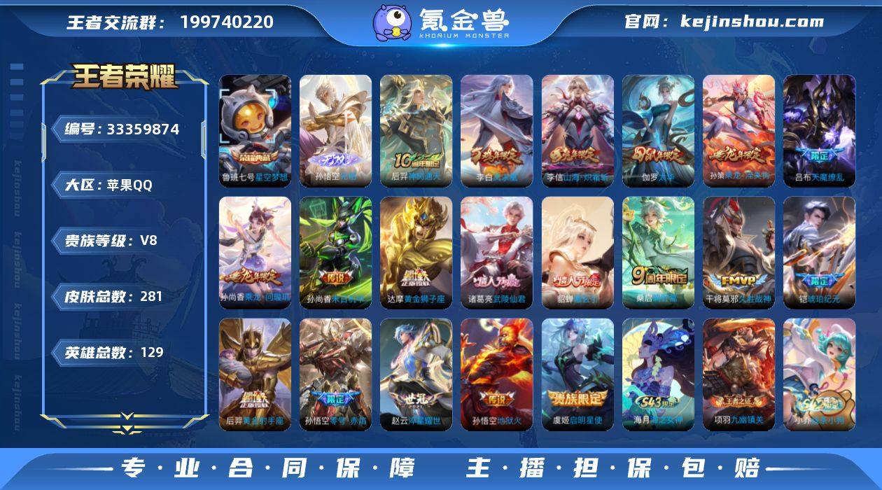 【956379】V8 1典藏 1无双 19传说 129英雄 281皮肤 可二次 可修改实名 男号 【英雄全皮】孙权全皮,盾山全皮,大禹全皮 【稀有英雄】敖隐(小龙人),大司命,嬴政(始皇帝),韩信(韩跳跳),夏洛特(夏师傅),艾琳,橘右京(橘子),娜可露露(鸟人),不知火舞,赵云,金蝉(唐僧),戈娅 【荣耀水晶】星空梦想(太空人) 【无双皮】无相 【传说皮】貂蝉曦玄引,乘龙·淬吴钩(孙策年限),琥珀纪元铠,乘龙·问璇玑(孙尚香年限),神树通天,山海·炽霜斩(李信年限),黄金狮子座,黄金射手座,零号·赤焰,地狱火,末日机甲-孙尚香(绿蚂蚱),淬星耀世,久胜战神 【珍宝阁皮】蔷薇恋人,女武神,玩趣恶龙 【赛季/战令皮】噬灭天穹(s37),海盐诗旅(s30),擒涛扼浪(s31),探海日志(s32),剑破天穹(s35),天穹祈灯(s34),天穹之誓(s36),饕餮(s9),烛龙(s10),重明(s11),穷奇(s12),御狮(s13),御霄(s14),御旌(s15),御銮(s16),朔风刀(s17),混沌棋(s18),疑决卦(s19),醍醐杖(s20),原初探秘者(s21),万华元夜(s22),演武夺筹(s23),驱傩正仪(s24),千军破阵(s25),猎兽之王,白昼王子,朔望之晖,蓝屏警告,神迹守卫-钟馗,狮舞东方,赤莲之焰,驯魔猎人,星空之诺,银河之约,西部大镖客-猪八戒,暗影游猎(游乐娃子),星际陆战队-达摩,胡桃异想国,圣弓游侠,真...