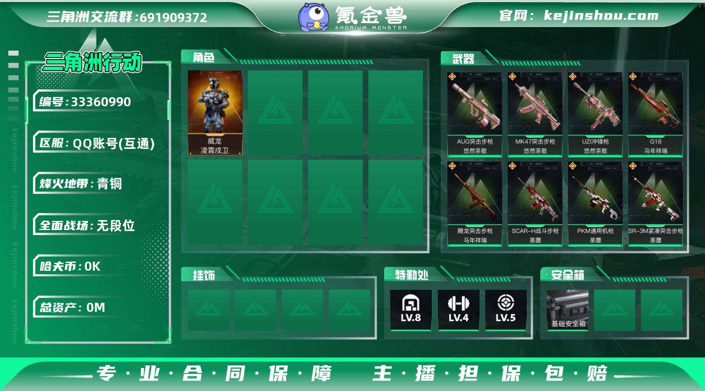 实名: 可修改 烽火地带段位: 青铜 全面战场段位: 无段位 总资产: 115 哈夫币: 1 干员外观: 威龙-凌霄戍卫 传说武器皮肤: QBZ95-1突击步枪-凌霄戍卫,腾龙突击步枪-马年祥瑞,G18-马年祥瑞,SCAR-H战斗步枪-荼蘼,PKM通用机枪-荼蘼,SR-3M紧凑突击步枪-荼蘼,勇士冲锋枪-万金泪冠,腾龙突击步枪-万金泪冠,AWM狙击步枪-万金泪冠,.357左轮-缄花,SR-25射手步枪-缄花,M14射手步枪-缄花,MK47突击步枪-悠然茶歇,AUG突击步枪-悠然茶歇,UZI冲锋枪-悠然茶歇