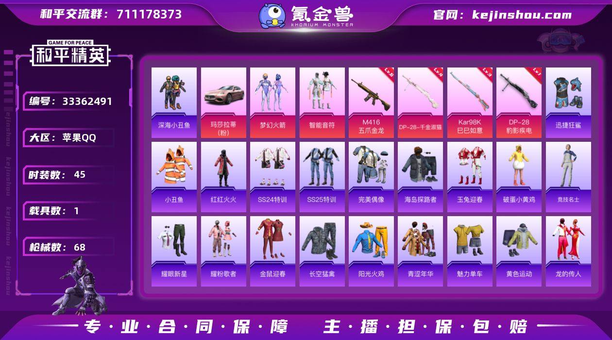 苹果手Q S-KWF433【2粉装7特效枪1载具3粉色飞行器 梦幻火箭/智能音符/深海小丑鱼/红红火火/奈斯】20848热力值3王牌印记45套装68枪皮 【热门品类】:套装-深海小丑鱼,套装-小丑鱼,粉装-梦幻火箭,套装-红红火火 【粉色套装】:粉装-梦幻火箭,粉装-智能音符 【粉色枪皮等级】:M416-五爪金龙(六级),UMP45-萌骑冒险(三级),AKS-74U-森灵之息(五级),Kar98K-巳巳如意(三级),Mk14-福马献瑞(三级),DP-28-千金淑猫(四级),DP-28-豹影疾电(一级) 【