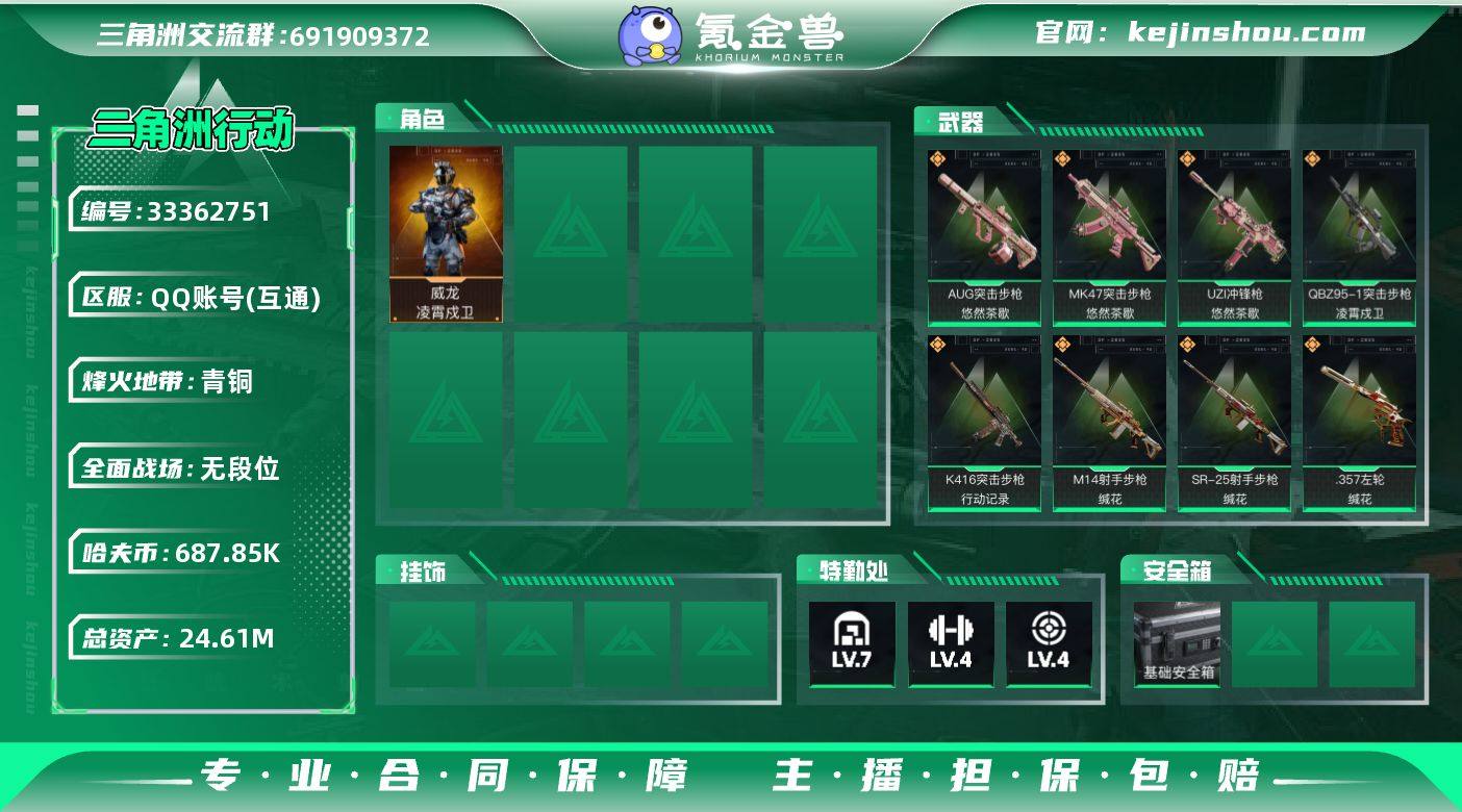 实名: 不可修改 烽火地带段位: 青铜 全面战场段位: 无段位 总资产: 24613211 哈夫币: 687853 干员外观: 威龙-凌霄戍卫 传说武器皮肤: QBZ95-1突击步枪-凌霄戍卫,K416突击步枪-行动记录,.357左轮-缄花,SR-25射手步枪-缄花,M14射手步枪-缄花,MK47突击步枪-悠然茶歇,AUG突击步枪-悠然茶歇,UZI冲锋枪-悠然茶歇 史诗武器皮肤: PKM通用机枪-蝮蛇,G3战斗步枪-哈夫克警备,MP7冲锋枪-六套之力