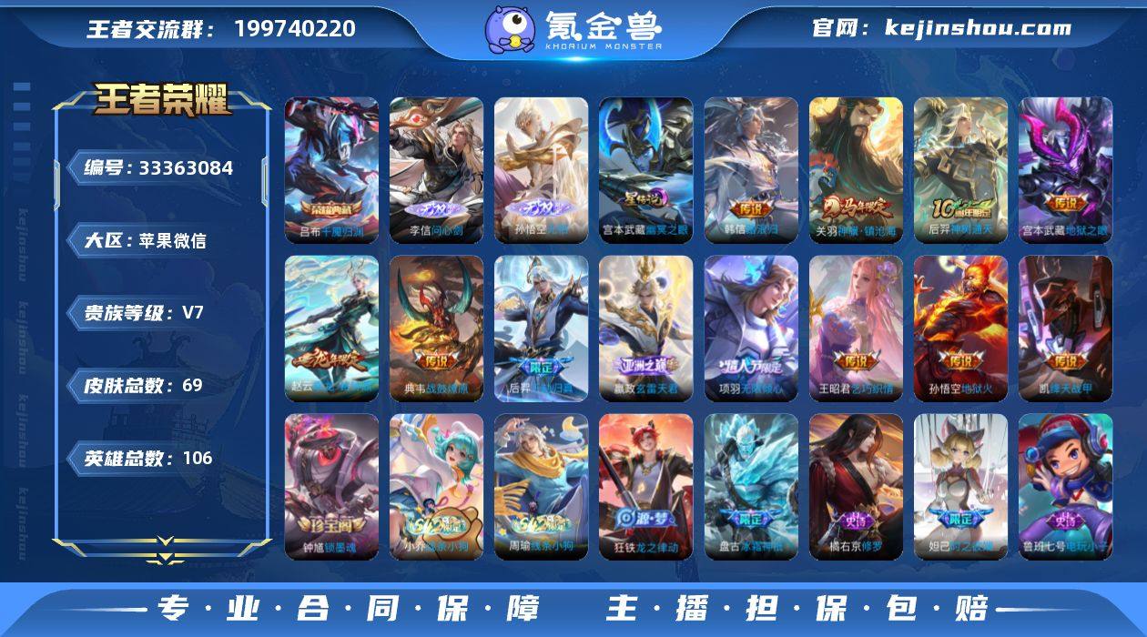 多限定精品小号!苹果WX-V7-最强王者段位-106英雄-69皮肤-1典藏皮肤-2无双-12传说-18史诗 【荣耀典藏】:吕布千魇归渊 【无双皮肤】:李信问心剑,孙悟空无相 【传说皮肤】:韩信踏浪归,关羽神骥镇沧海,后羿神树通天,后羿千劫归真,嬴政玄雷天君,典韦战鼓燎原,赵云乘龙铭钟鼎,项羽无限倾心,王昭君乞巧织情,铠绛天战甲,宫本武藏地狱之眼,孙悟空地狱火 【限定皮肤】:姜子牙天穹之誓,狄仁杰阴阳师,赵云皇家上将,妲己时之彼端,狄仁杰魔术师,项羽海滩派对,项羽无限倾心,鲁班大师探海日志,盘古冰霜神祇,阿古朵江河有灵,赵云乘龙铭钟鼎,周瑜熔金海岸 【年限皮肤】:赵云乘龙铭钟鼎 【赛季限定】:鲁班大师探海日志,姜子牙天穹之誓 【战令限定】:廉颇撼地雄心,周瑜线条小狗,小乔线条小狗 【史诗皮肤】:钟馗锁墨魂,周瑜线条小狗,小乔线条小狗,狂铁龙之律动,廉颇撼地雄心,阿古朵江河有灵,盘古冰霜神祇,橘右京修罗,妲己时之彼端,狄仁杰鹰眼统帅,亚瑟心灵战警,诸葛亮黄金分割率,李白千年之狐,曹操幽灵船长,孙尚香水果甜心,狄仁杰魔术师,王昭君偶像歌手,赵云皇家上将,鲁班七号电玩小子 【其他皮肤】:鲁班七号班班快跑,虞姬溯影追猎,艾琳鹤...