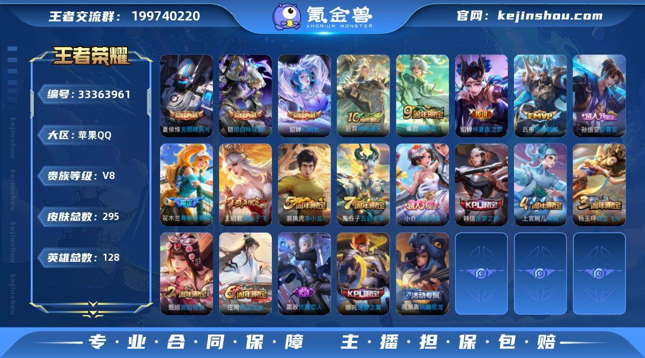 苹果Q 可二次 3典藏9传说128英雄295皮肤 无限飓风号 银白咏叹调 幻阙歌 曦玄引貂蝉 战鼓燎原 神树通天 鸣野蒿 启明星使 山海琳琅生 怒海麟威 超时空战士男 仲夏夜之梦 万灵启世 巫礼祀神 至尊宝 山海碧波行 逐梦之影 逐梦之翼 逐霄之志 纯白花嫁 凤凰于飞 青春决赛季 拒霜思 神迹守卫钟馗 梁祝 苍穹之光 电玩小子 雪豹霜爪 星界特工 燃音魔法 天秀音浪 电玩爆裂旋风 天秀启明 原初探秘者 李小龙 水晶猎龙者 暗隐猎兽者 金属风暴 特工魅影 曙光守护者 特工战影 黄金分割率 优雅恋人 玩趣恶龙 逐浪之夏 心灵战警 千年之狐 紫霞仙子 功夫厨神 心灵骇客 圣诞恋歌 幽灵船长 乘风破浪 圣诞狂欢 末日机甲男 星夜王子 节奏热浪 天才门将 绅士熊喵 暗夜贵公子 偶像歌手 街头霸王 箭羽风息 暗渊魔法 摇滚巨星 缤纷独角兽 鬼剑武藏 德古拉伯爵 冰雪圆舞曲 青焰无极 花好人间 苍威无极 炼金王 凯尔特女王 狰 饕餮 烛龙 重明 穷奇 御狮 御霄 御旌 御銮 朔风刀 混沌棋 疑决卦 醍醐杖 万华元夜 演武夺筹 群星魔术团程咬金 驱傩正仪 未来纪元赵云 千军破阵 拳王 沙漠行僧 女仆咖啡