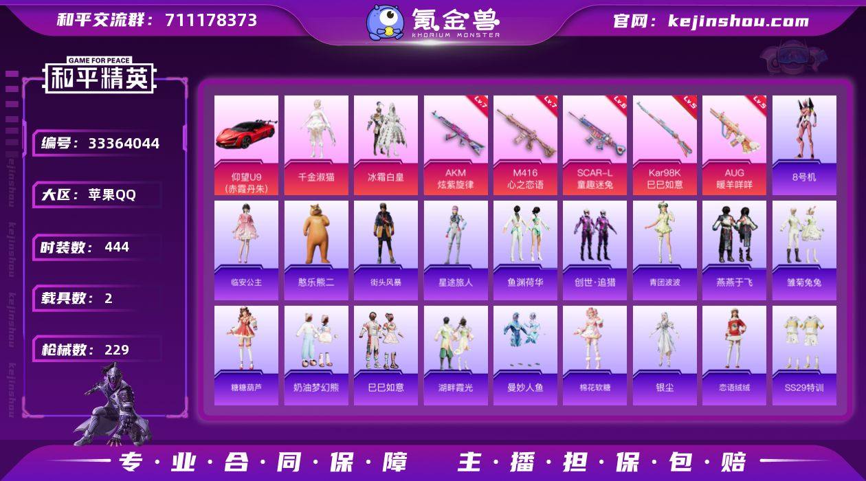 【特价出售】苹果Q-1稀有2载具2粉装6特效枪7热门126套装229枪皮 69619热力值 14印记 历史传奇王牌13星 【1稀有】 SCAR-L-粉色回忆 【2载具】 仰望U7先锋版(阿盖尔紫) 仰望U9(赤霞丹朱) 【2粉装】 千金淑猫 冰霜白皇 【6特效枪】 M416-心之恋语 (7级) AKM-炫紫旋律 (7级) Kar98K-巳巳如意 (5级) AUG-暖羊咩咩 (5级) SCAR-L-童趣迷兔 (6级) Mk14-福马献瑞 (1级) 【7热门】 8号机 Mark.06 团圆交子 瑞龙福将 破蛋小黄鸡 军刀雅典娜 M762-瑞龙福将 【1飞行器】 闪光银龙飞行器 【1头盔】 童趣迷兔头盔 【1背包】 深海小丑鱼背包