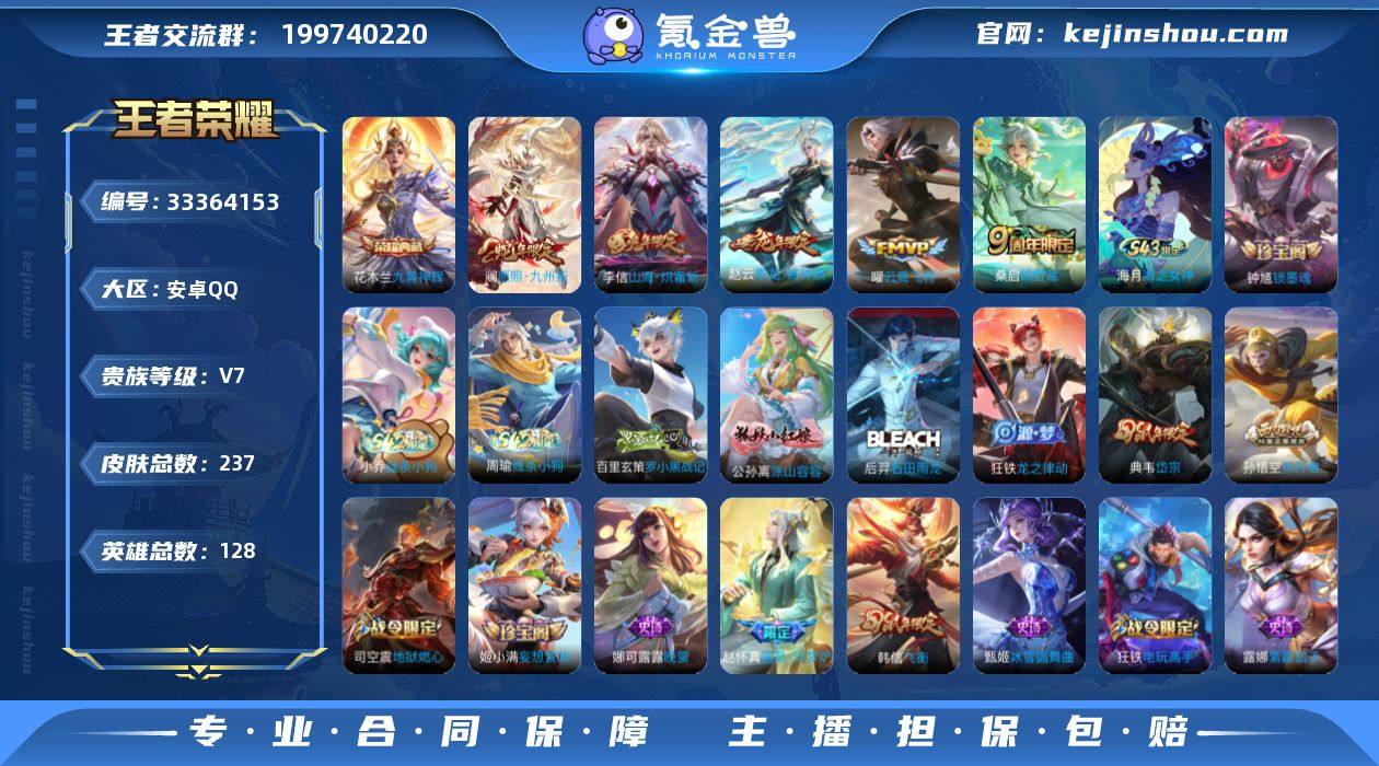 安卓Q-V7-尊贵铂金I段位-128英雄-237皮肤-1典藏皮肤-5传说-64史诗 【英雄全皮】:敖隐全皮,戈娅全皮 【荣耀典藏】:花木兰九霄神辉 【传说皮肤】:澜愿照九州拓,桑启鸣野蒿,赵云乘龙铭钟鼎,李信山海炽霜斩,曜云鹰飞将 【限定皮肤】:姜子牙天穹之誓,杨戬破阵退雄兵,李白谪仙醉月,狄仁杰阴阳师,赵云皇家上将,孙尚香蔷薇恋人,元歌无心,典韦岱宗,狄仁杰魔术师,狄仁杰万华元夜,项羽海滩派对,程咬金演武夺筹,韩信飞衡,王昭君午后时光,兰陵王金庭之子,孙悟空孙行者,李元芳云中旅人,钟馗驱傩正仪,鬼谷子五谷丰年,苏烈千军破阵,沈梦溪大漠名商,裴擒虎李小龙,裴擒虎擒涛扼浪,狂铁电玩高手,云中君纤云弄巧,李信山海炽霜斩,嫦娥拒霜思,嫦娥暖冬兔眠,西施玲珑珍味,鲁班大师探海日志,桑启海盐诗旅,暃星界游侠,戈娅驭风魔法,艾琳流音漫舞,司空震地狱燃心,阿古朵江河有灵,张良古海寻踪,蒙犽百解令,鬼谷子天穹祈灯,姬小满妄想食味,赵云乘龙铭钟鼎,沈梦溪龙舞盛年,刘邦剑破天穹,程咬金群星魔术团,镜青焰无极,项羽苍威无极,芈月浮光幕影,周瑜熔金海岸 【年限皮肤】:典韦岱宗,韩信飞衡,李信山海炽霜斩,赵云乘龙铭钟鼎,澜愿照九州拓 【...