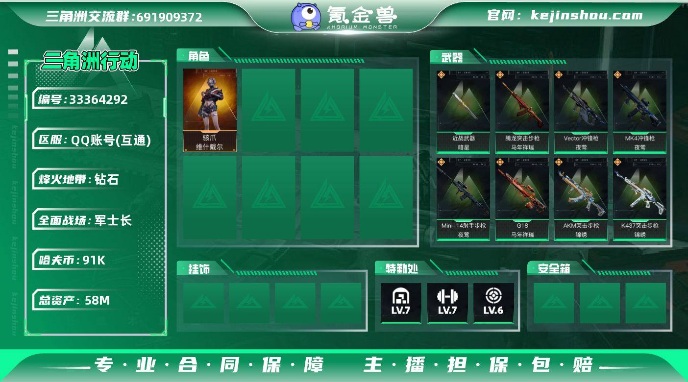 【sjs10780】包人脸 玩够能回血 1红1刀带暗星 sjs10780 58m总资产-91k哈夫币-60烽火等级-钻石-22战场等级-军士长 【干员外观】:骇爪-维什戴尔 【近战皮肤】:近战-暗星,近战-黑鹰 【传说外观】:M4A1突击步枪-蚀金玫瑰,M4A1突击步枪-阿米娅,AKM突击步枪-锦绣,ASh-12战斗步枪-鹅鸭杀,SCAR-H战斗步枪-启航,G3战斗步枪-骑士,CAR-15突击步枪-阿米娅,腾龙突击步枪-马年祥瑞,K437突击步枪-锦绣,Vector冲锋枪-夜莺,SMG-45冲锋枪-锦绣,QCQ171冲锋枪-鹅鸭杀,MK4冲锋枪-夜莺,M250通用机枪-骑士之心,QJB201轻机枪-鹅鸭杀,Mini-14射手步枪-夜莺,M14射手步枪-蛮荒,R93狙击步枪-维什戴尔,G18-马年祥瑞 【史诗外观】:K416突击步枪-腊梅,AUG突击步枪-蝮蛇,G3战斗步枪-哈夫克警备,MP5冲锋枪-战术竞备,MP5冲锋枪-竞技风,P90冲锋枪-莫斯提马,SMG-45冲锋枪-阿萨拉特攻,勇士冲锋枪-工业狂潮,勇士冲锋枪-丛影谍踪,MP7冲锋枪-守护者,MP7冲锋枪-六套之力,S12K霰弹枪-曙光,M249轻机枪-丛影谍踪,QJB201轻机枪-炽焰,VSS射手步枪-丛影谍踪,SV-98狙击步枪-囚徒,AWM狙击步枪-无极限,复合弓-守护者 【稀有外观】:AKM突击步枪-肃杀,QBZ95-1突击步枪-公平竞技,K416突...