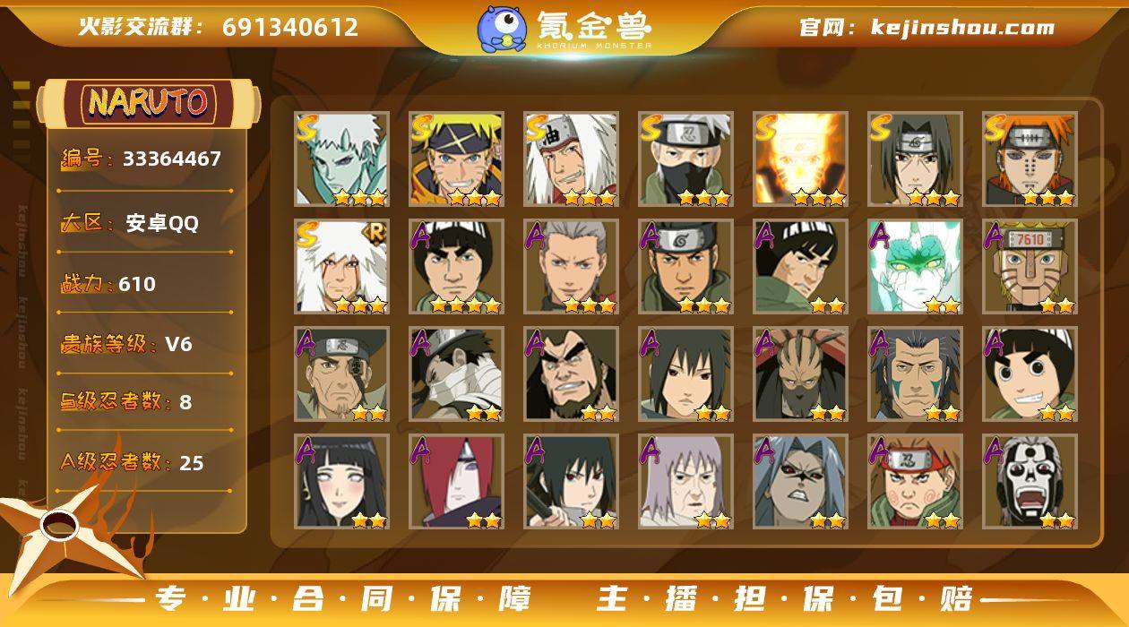 【HYYH1497】VIP等级V6/战力610W/S忍数量8/A忍数量25/三星S-宇智波带土「十尾人柱力」/二星A-飞段「死司凭血」/二星A-宇智波鼬/三星S-旗木卡卡西「须佐能乎」/二星A-长门「青年」/二星A-宇智波佐助「疾风传咒印」/2星小南「神驹佑将」/三星A-飞段/二星A-蝎/三星S-佩恩「天道」/三星S-漩涡鸣人·宇智波佐助/三星S-漩涡鸣人 「九喇嘛连结」/二星A-秋道丁次「忍界大战」/二星A-李洛克「忍界大战」/二星A-土台「忍界大战」/2星旗木卡卡西「神威对决」/二星A-蝎「绯流琥」/三星S-自来也「舞之豪杰」/二星A-桃地再不斩「秽土转生」/四星A-迈特凯/三星S-自来也 「传说中的三忍」/二星A-日向雏田 「最终章」/二星A-神农 「羁绊」/二星A-宇智波泉奈/二星A-巳月「仙人模式」/二星A-干柿鬼鲛/二星A-不动/三星A-猿飞阿斯玛/二星A-迈特凯「青春爆炸」/二星A-宇智波佐助「须佐能乎」/二星A-机械鸣人「初始形态」/二星A-千代「近松十人卫」/三星S-宇智波鼬 「须佐能乎」