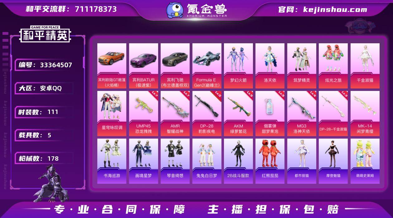 【LHPD242】111套装/枪械10/装备197/载具5/战备119/王牌印记12/热力值62434/五级AKM-绿萝繁花/三级AKM-暮色玫影/七级UMP45-恐龙拽拽/五级AKS-74U-森灵之息/七级AMR-智耀战神/三级DP-28-千金淑猫/五级DP-28-豹影疾电/四级MG3-洛神天依/五级烟雾弹-甜梦果泡/一级暮色玫影-艾丽娅/暮色玫影-艾丽娅/梦幻火箭(新101)/2B战斗服款/红熊茄茄/洛天依/筑梦精灵/炫光之旅/千金淑猫/星穹咏叹调/宾利欧陆GT敞篷(火焰橘)/宾利BATUR(极速紫)/宾利飞驰(布罗德盖棕双色)/Formula E Gen2(巅峰兰)/暮色幽蹄/AKM绿萝繁花/AKM-暮色玫影/UMP45恐龙拽拽/AKS-74U-森灵之息/MK14闲梦青缨/AMR-智耀战神/DP-28-千金淑猫/DP-28-豹影疾电/MG3洛神天依/烟雾弹-甜梦果泡/梦幻火箭飞行器/沙丘之主天马飞行器/雀灵庇佑飞行器/暮色之舞飞行器/绝对恒星降落伞/梦幻火箭降落伞/洛神天依降落伞/蓝莓炮弹降落伞/庄周梦蝶降落伞/第五大道降落伞/炫光之旅降落伞/镜光幻境降落伞/沙丘之主降落伞/精灵梦叶罗丽降落伞/千金淑猫降落伞/智耀战神降落伞/幻海仙踪降落伞/星穹咏叹调降落伞/暮色玫影降落伞/套装-雪国风尚/都市丽猫/摩登魅猫/萌萌史莱姆/粉恋花/紫幽梦/蓝冰羽/瑰梦爱神/幽澜祭司/鲛海歌灵/星渊小夜曲/极速光影/书...